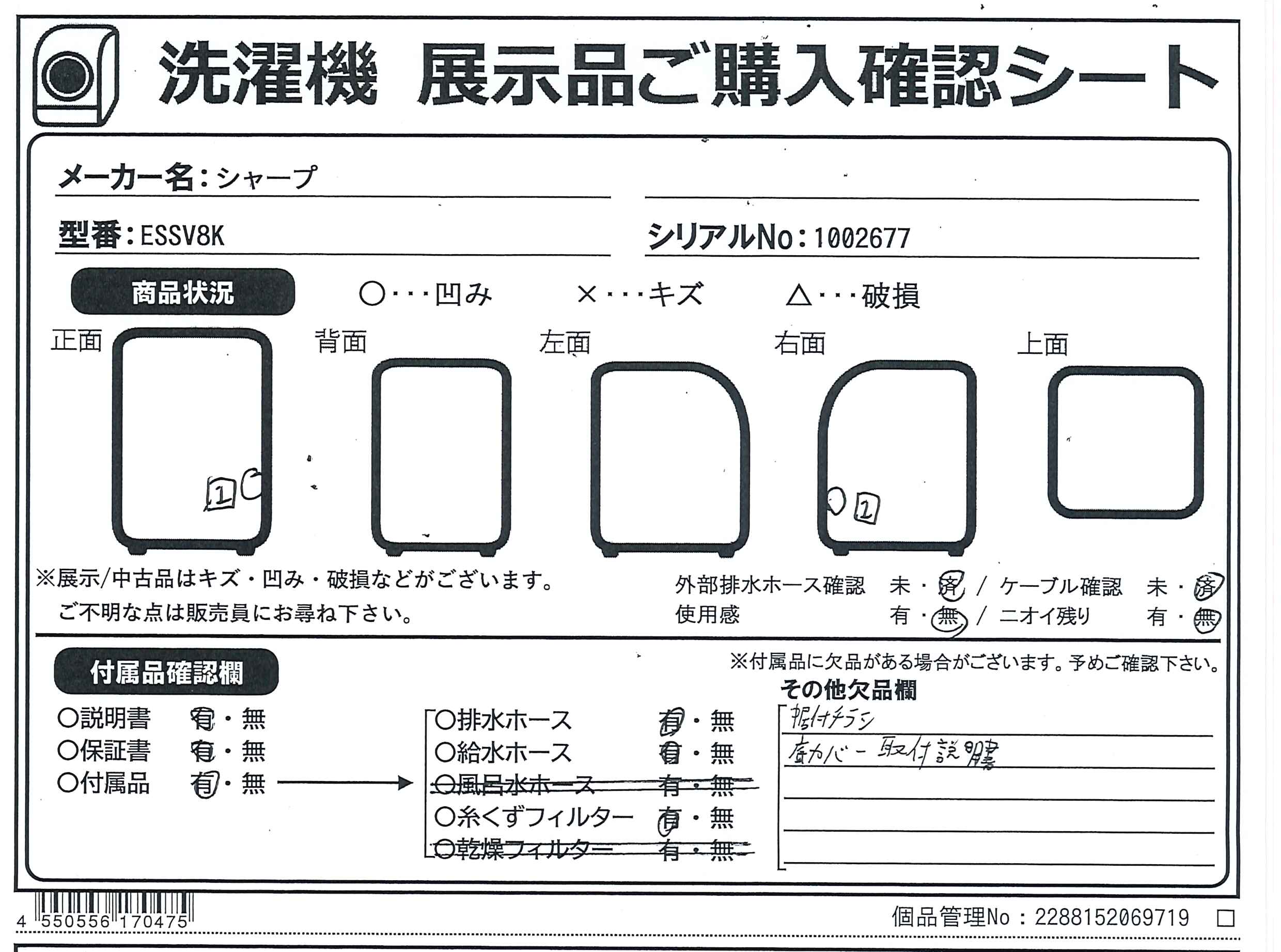 中古商品ランクについて 付属品・商品状態について 〔付属品〕取扱説明書、洗剤ご使用ガイド、給水ホース、水栓つぎて、柔軟剤タンク(ふた:グレー)、液体洗剤タンク(ふた:水色)、脚スペーサー(6mm)×2、接着テープ×2、底カバー取付ねじ×6、底カバー