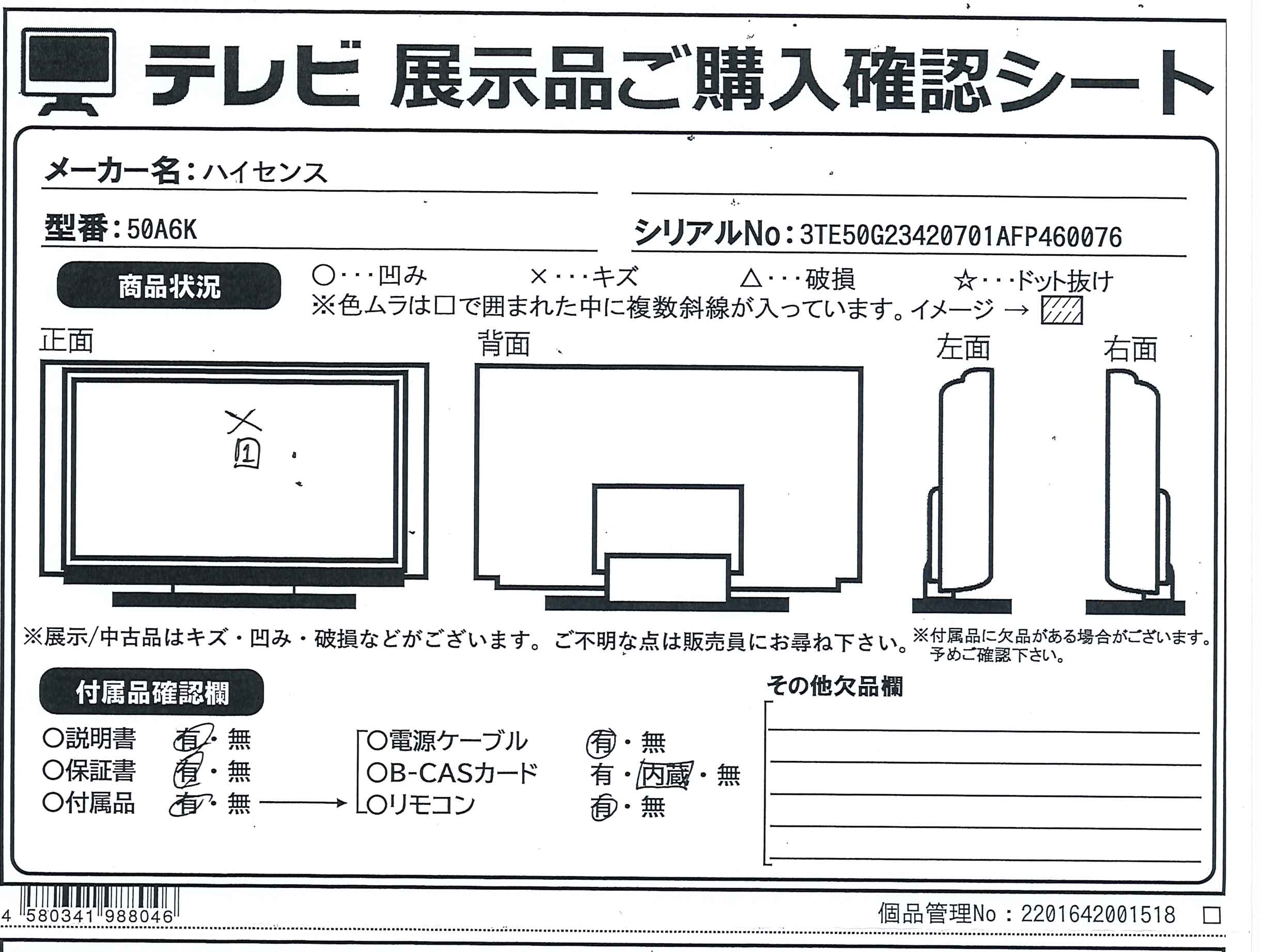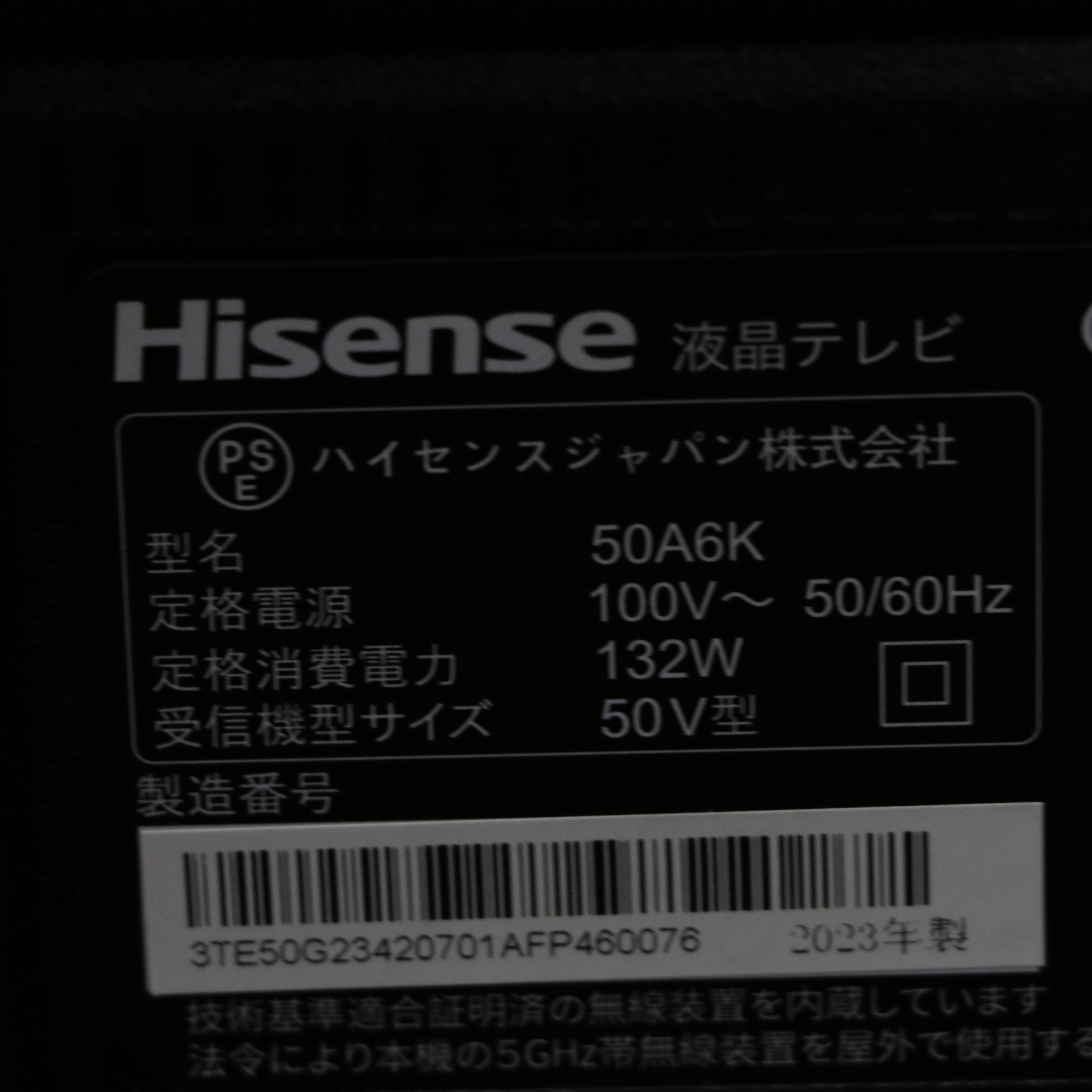 〔展示品〕 液晶テレビ 50A6K [50V型 /Bluetooth対応 /4K対応 /BS・CS 4Kチューナー内蔵 /YouTube対応]