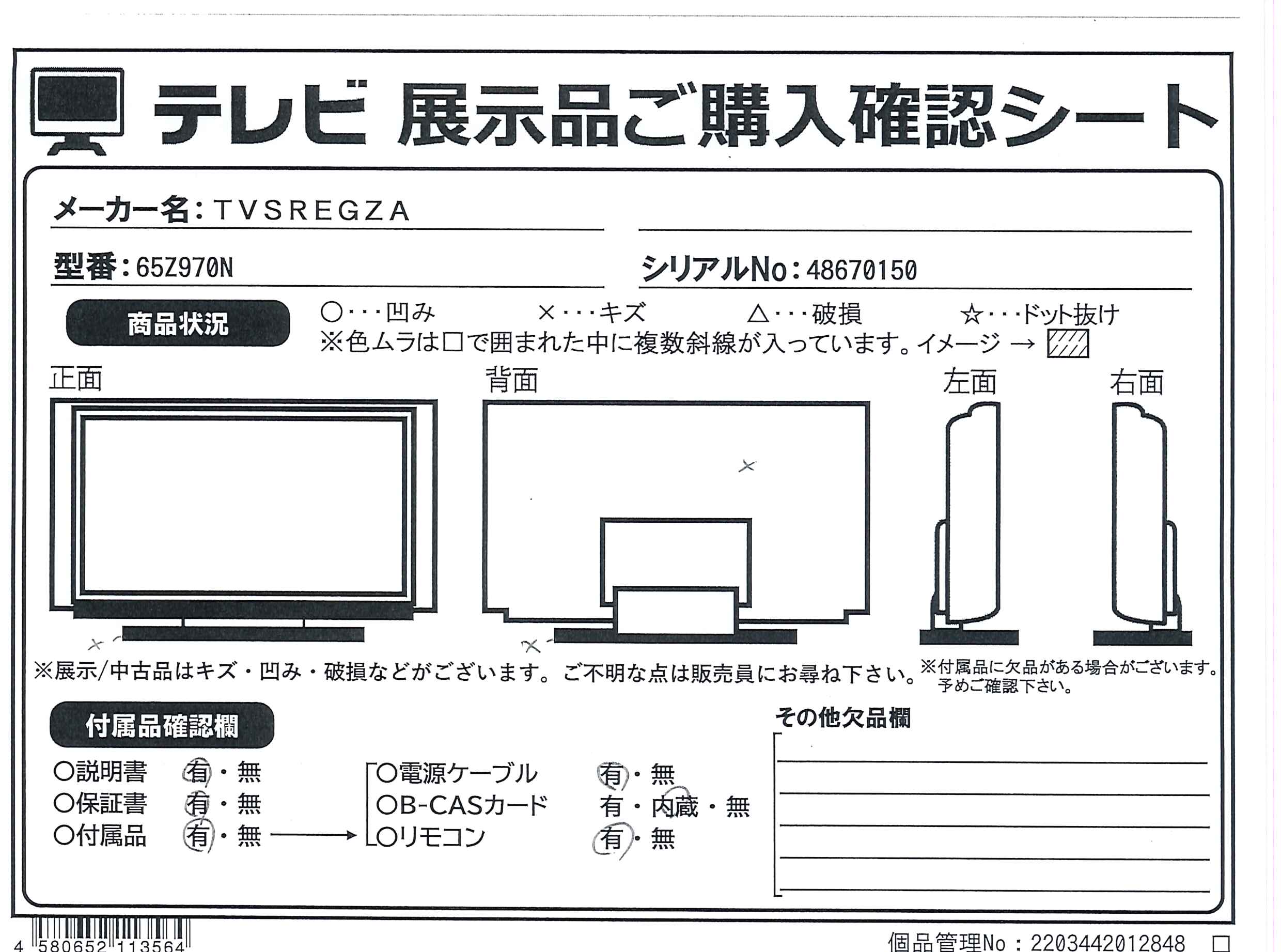中古商品ランクについて 付属品・商品状態について 〔付属品〕説明書、スタンド一式、スタンドカバー一式、リモコン、単四型乾電池×2、電源コード、転倒防止バンド一式