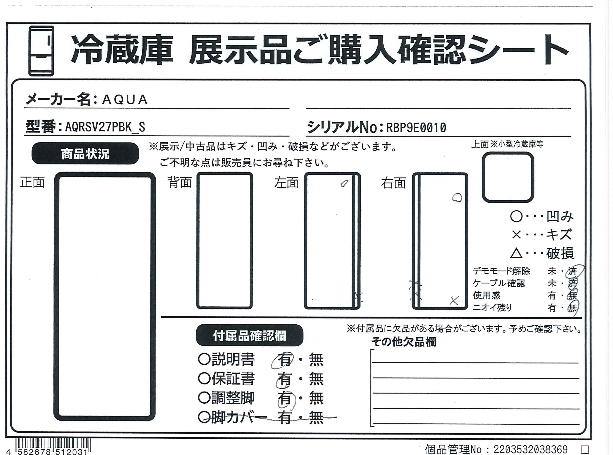 ▼同型番の新品商品はこちら![]() AQUA 冷蔵庫 ブライトシルバー AQR-SV27PBK(S) [幅60cm /272L /3ドア /右開きタイプ /2023年] 【基本設置料金セット】 ¥104,800(税込) 10,480ポイントサービス 在庫限り |