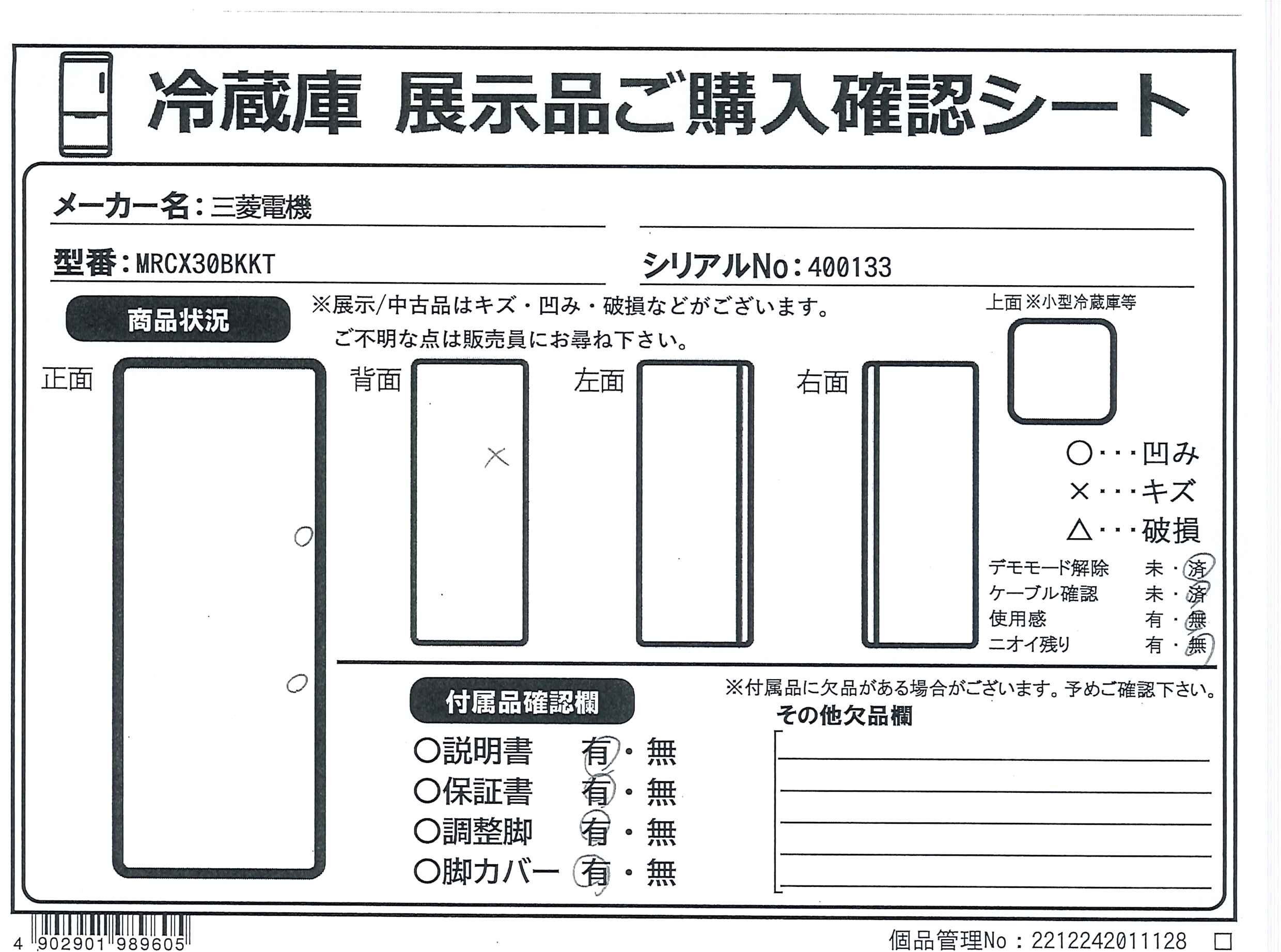 中古商品ランクについて 付属品・商品状態について 〔付属品〕取扱説明書、調整脚×2、ガラスシェルフ、氷点下ストッカーケース、給水タンク(浄水フィルターつき)、フリーポケット(大)、フリーポケット(小)、小物ポケット、タマゴトレイ、ボトルポケット、ボトルストッパー、フリーケース(タマゴトレイつき)、野菜ケース、野菜小物ケース、クリーントレイ、フリージングケース(上)、フリージングケース(下)、防音マット、アイスサーバー、脚カバー