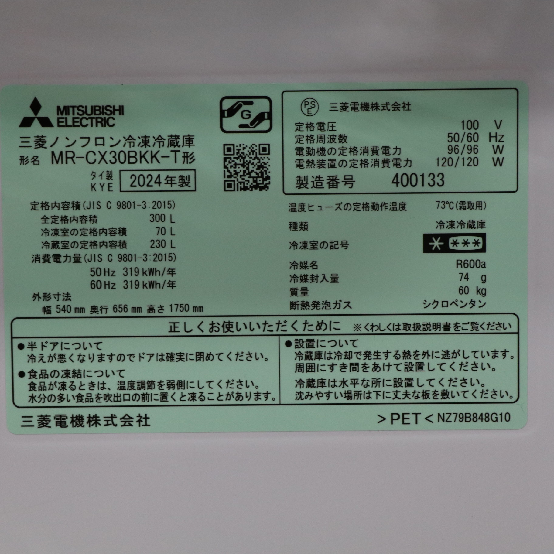 〔展示品〕 冷蔵庫 BKシリーズ ダークブラウン MR-CX30BKK-T [幅54cm /300L /3ドア /右開きタイプ /2024年]
