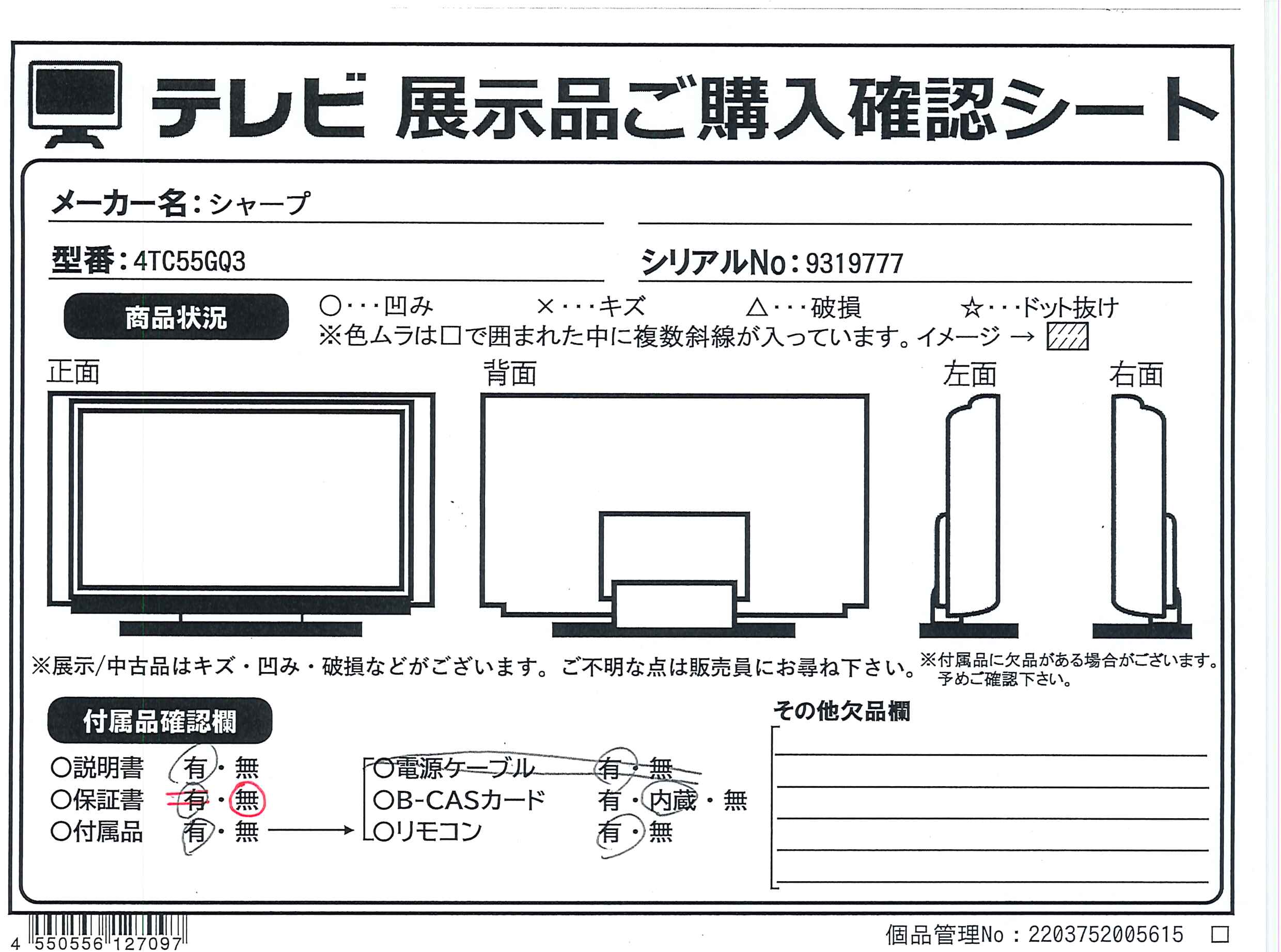 ▼同型番の新品商品はこちら![]() SHARP(シャープ) 有機ELテレビ AQUOS 4T-C55GQ3 [55V型 /Bluetooth対応 /4K対応 /BS・CS 4Kチューナー内蔵 /YouTube対応] ¥151,200(税込) 0ポイントサービス 在庫限り |