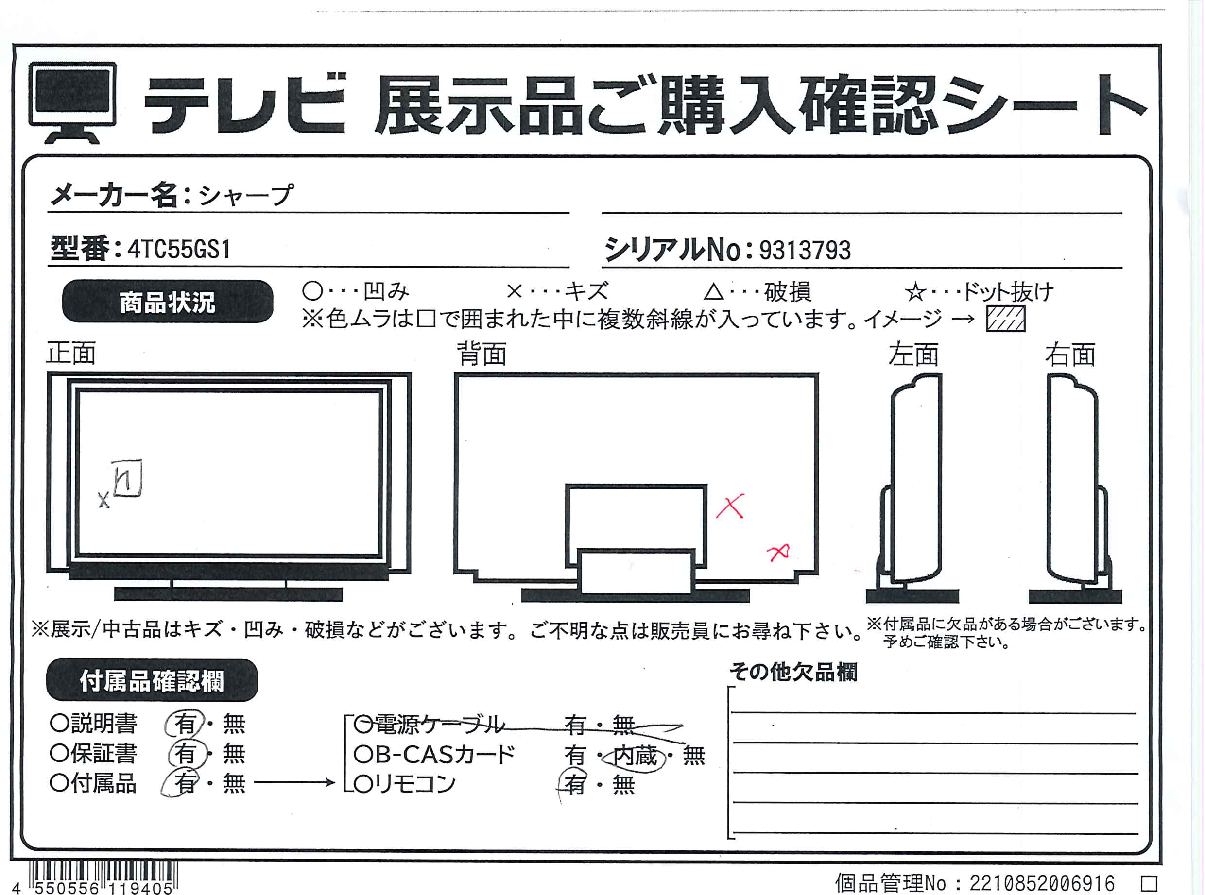 『B-CASカード(赤色)』 の付属については、付属品欄 および 展示品ご購入確認シート(画像)にてご確認ください。