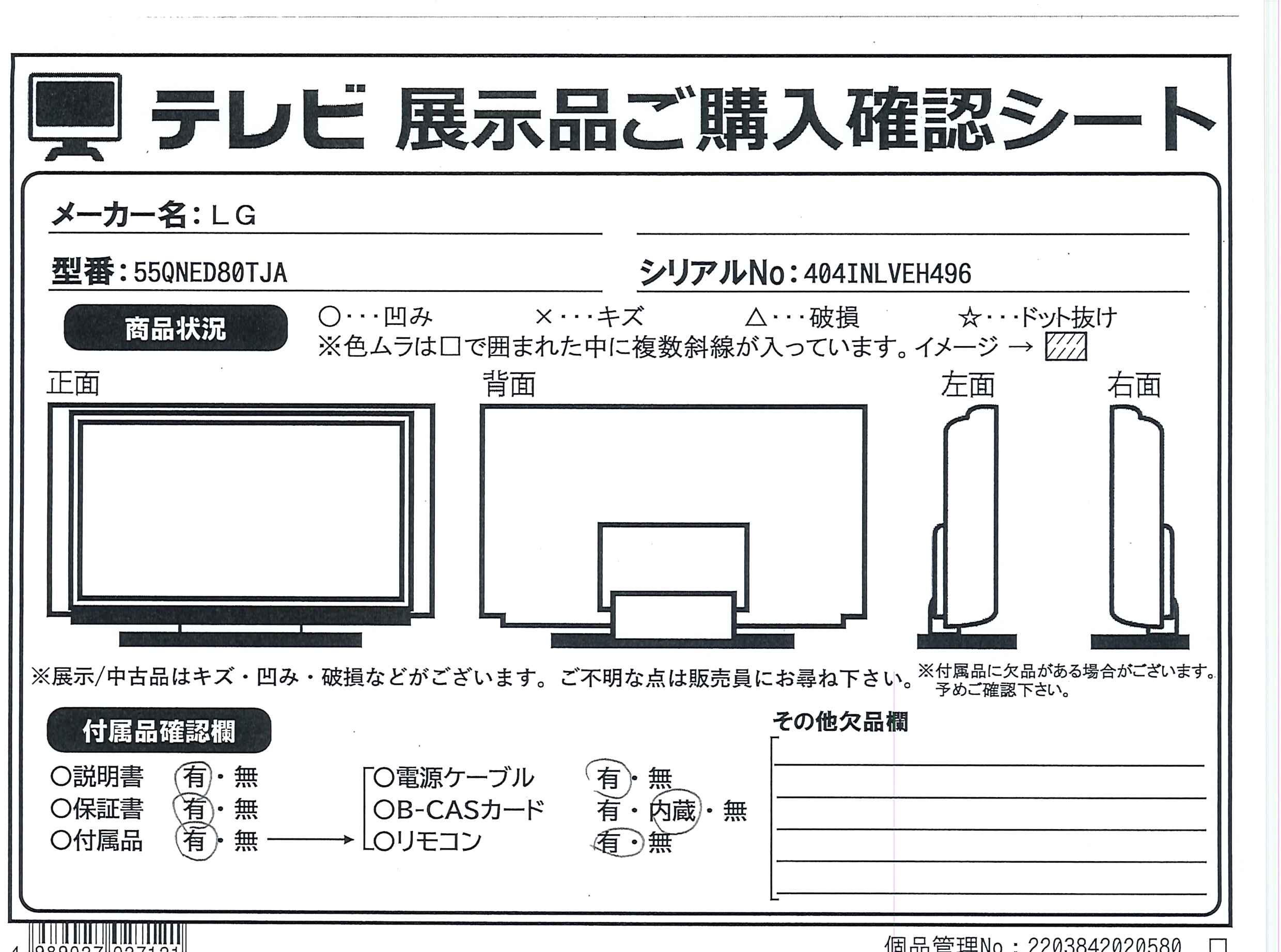 中古商品ランクについて 付属品・商品状態について 〔付属品〕取扱説明書、ガイド、電源コード、マジックリモコン、単4形乾電池×2、スタンド×2、スタンドケーブルホルダー×2、ケーブルホルダー(大)、スタンド固定用ネジ(M4)×4、ケーブルホルダー(小)、転倒防止バンド一式