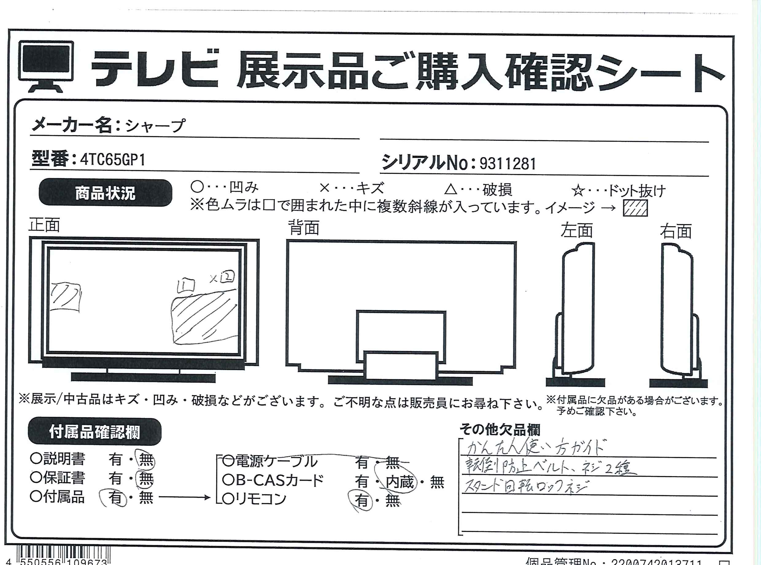 中古商品ランクについて 付属品・商品状態について 〔付属品〕リモコン、リモコン用乾電池×2、スタンド取付金具、スタンドカバー、スタンドベース、スタンド組立用ネジ×4、スタンド取付用ネジ×4