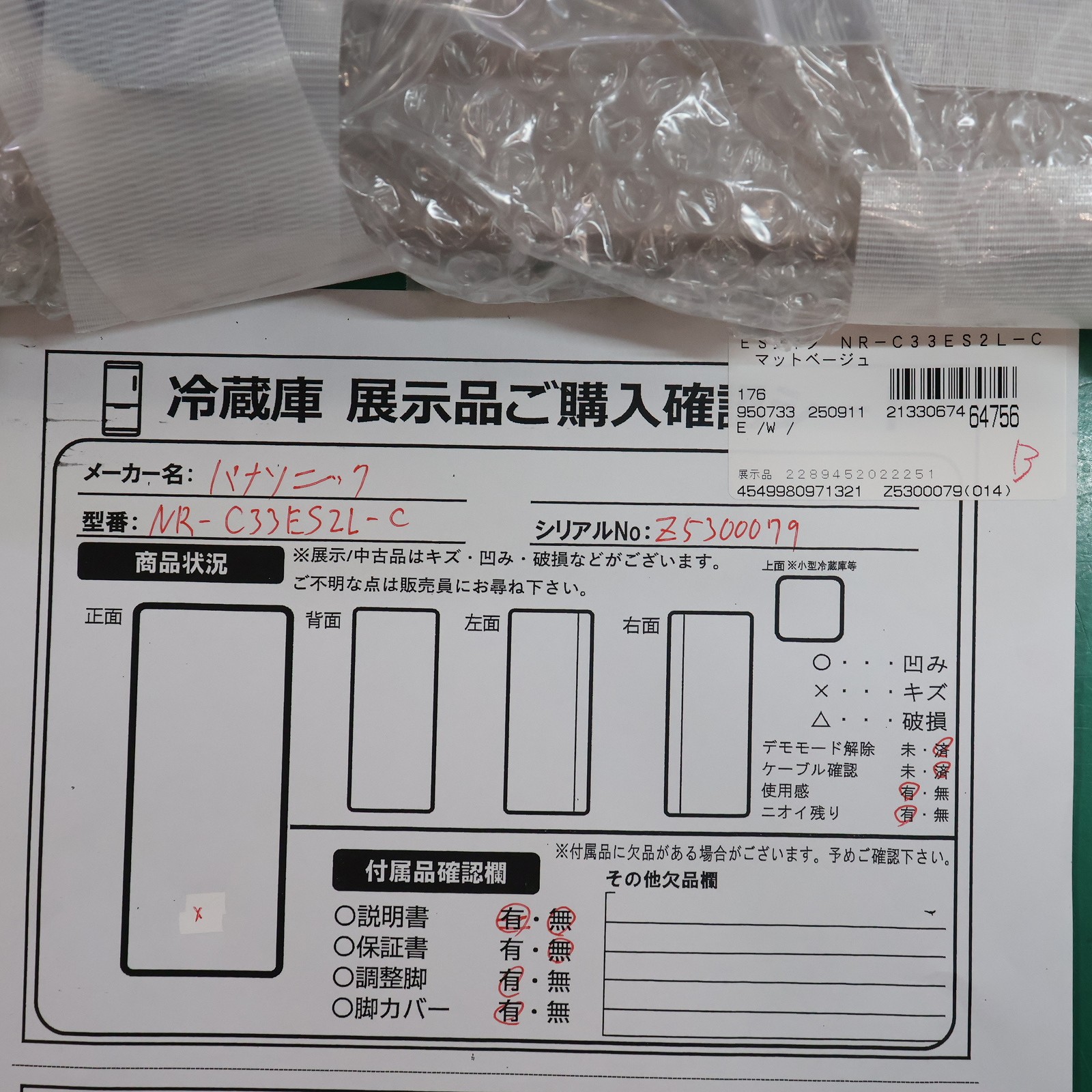 〔中古品〕 冷蔵庫 ESタイプ マットベージュ NR-C33ES2L-C [幅60cm /326L /3ドア /左開きタイプ /2025年]