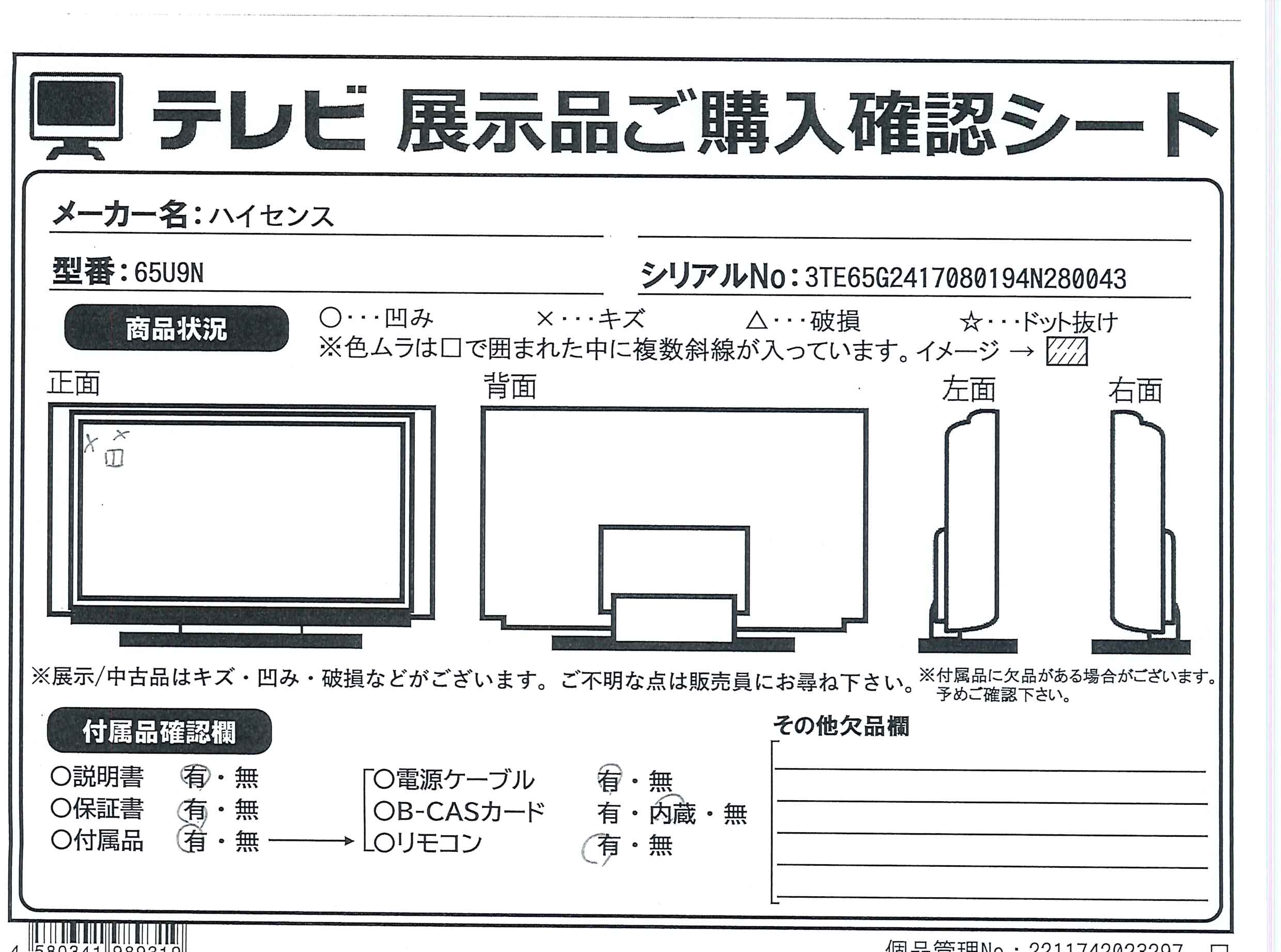 商品名 〔展示品〕 液晶テレビ 65U9N [65V型 /Bluetooth対応 /4K対応 /BS・CS 4Kチューナー内蔵 /YouTube対応]