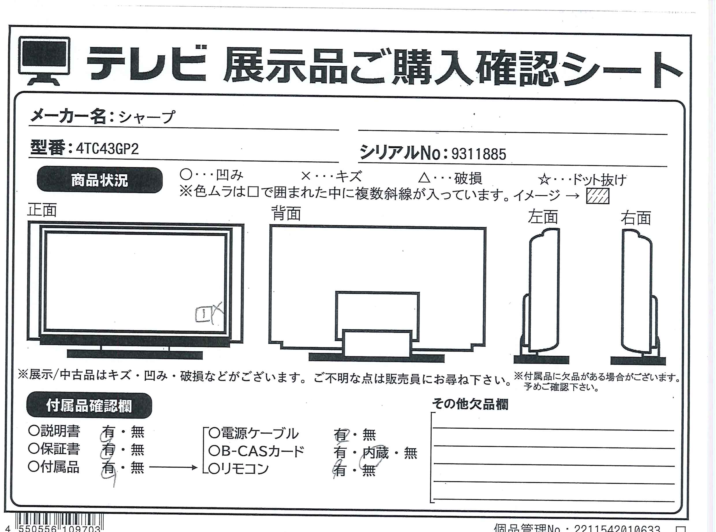 ▼同型番の新品商品はこちら![]() SHARP(シャープ) 液晶テレビ AQUOS ブラック 4T-C43GP2 [43V型 /Bluetooth対応 /4K対応 /BS・CS 4Kチューナー内蔵 /YouTube対応] ¥168,000(税込) 0ポイントサービス 在庫限り |