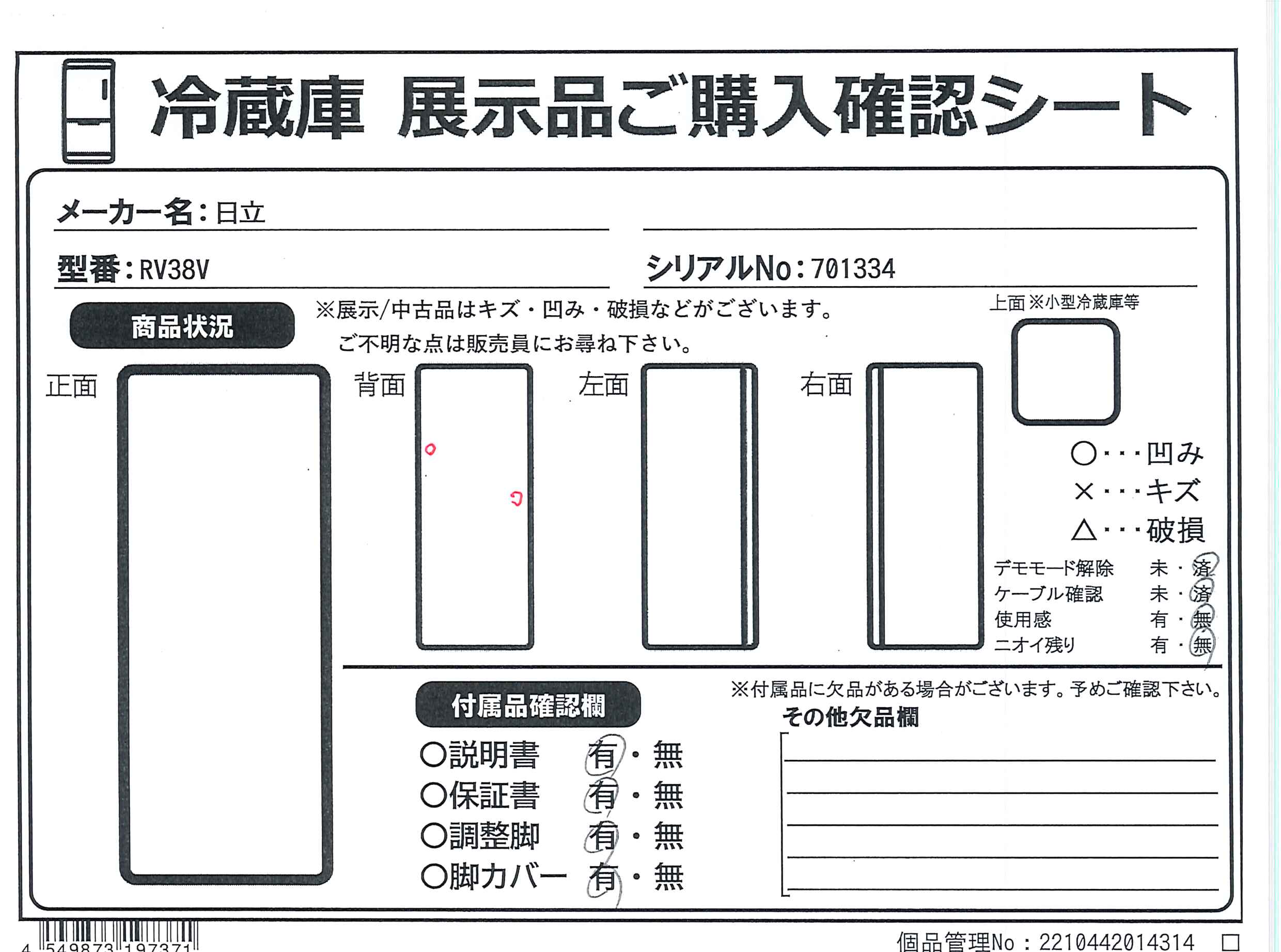 中古商品ランクについて 付属品・商品状態について 〔付属品〕説明書、調節脚×2、小物ケース、卵スタンド、給水タンク、脚カバー、製氷スコップ、蒸発皿