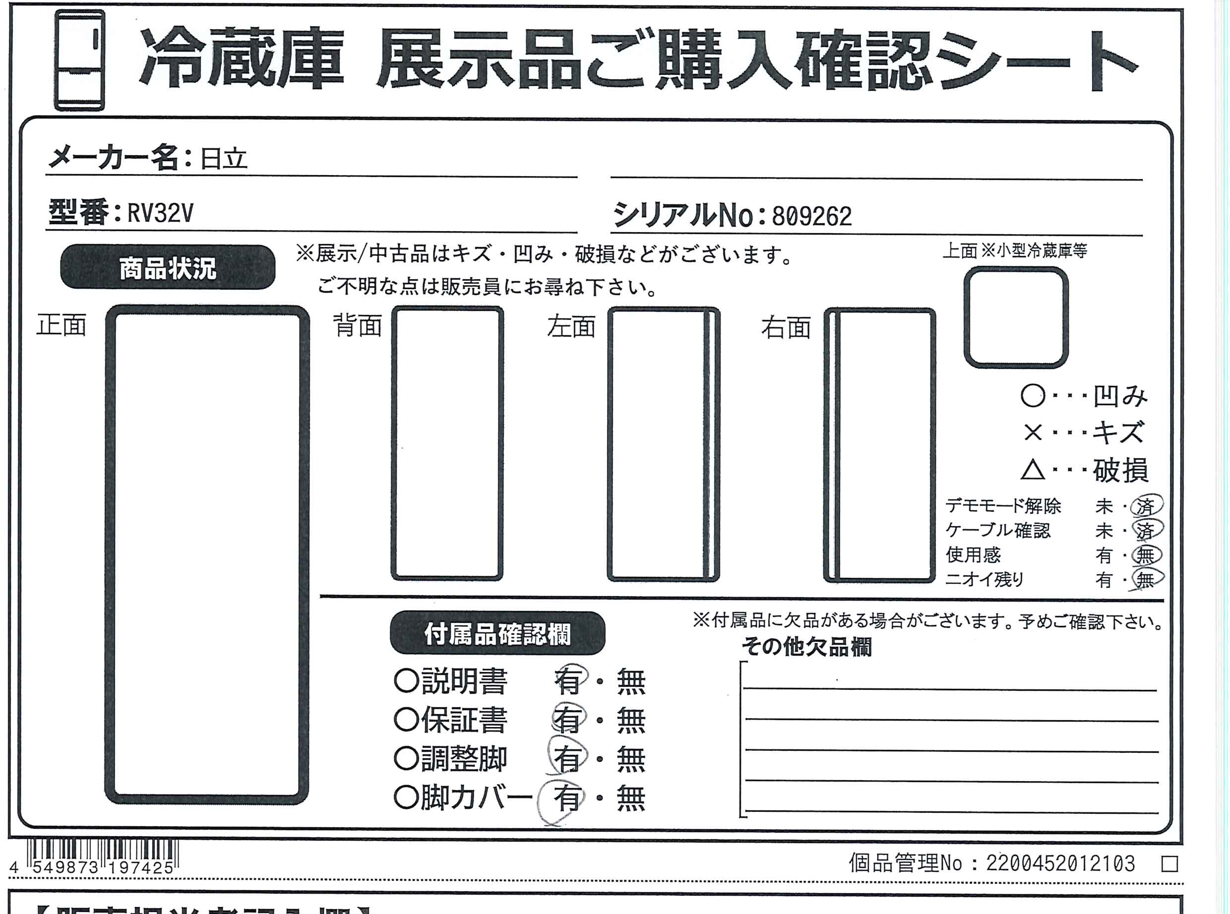 中古商品ランクについて 付属品・商品状態について 〔付属品〕説明書、調節脚X2、脚カバー、小物ケース、卵スタンド、給水タンク、製氷スコップ、蒸発皿