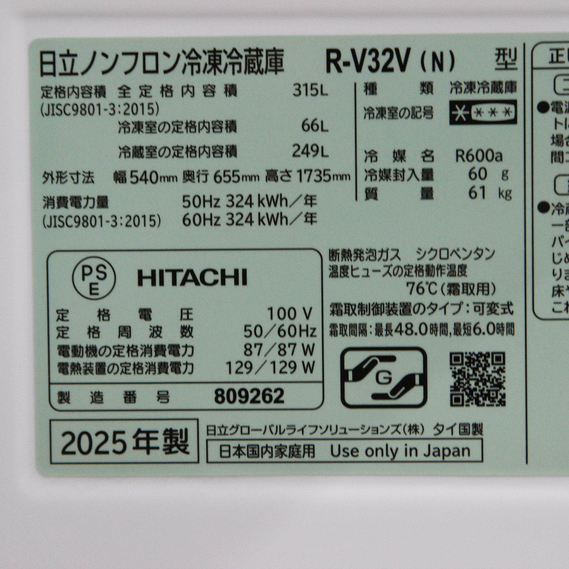 〔展示品〕 冷蔵庫 Vタイプ ライトゴールド R-V32V-N [幅54cm /315L /3ドア /右開きタイプ /2024年]