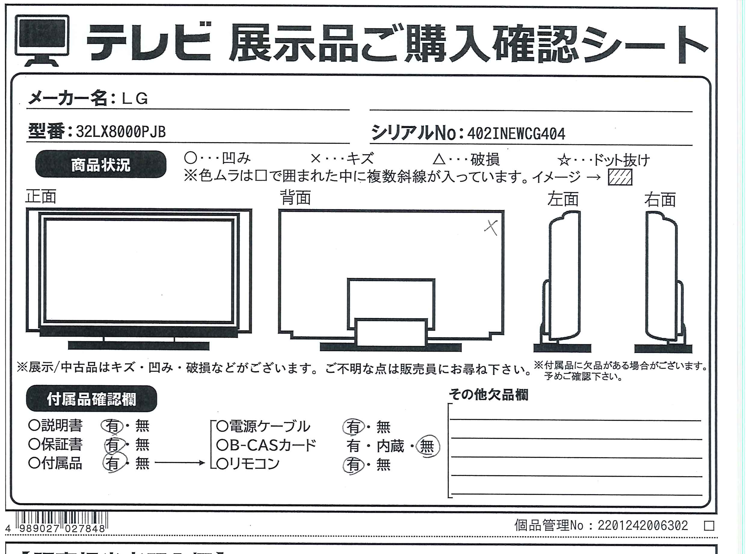 中古商品ランクについて 付属品・商品状態について 〔付属品〕取扱説明書、ガイド、標準リモコン、単4形乾電池×2、スタンド×2、スタンド固定用ネジ(M4×16mm)×2、電源コード、ケーブルホルダー、転倒防止バンド、転倒防止バンド取付用ネジ(M4×10mm)、転倒防止固定用ネジ(M4×20mm)