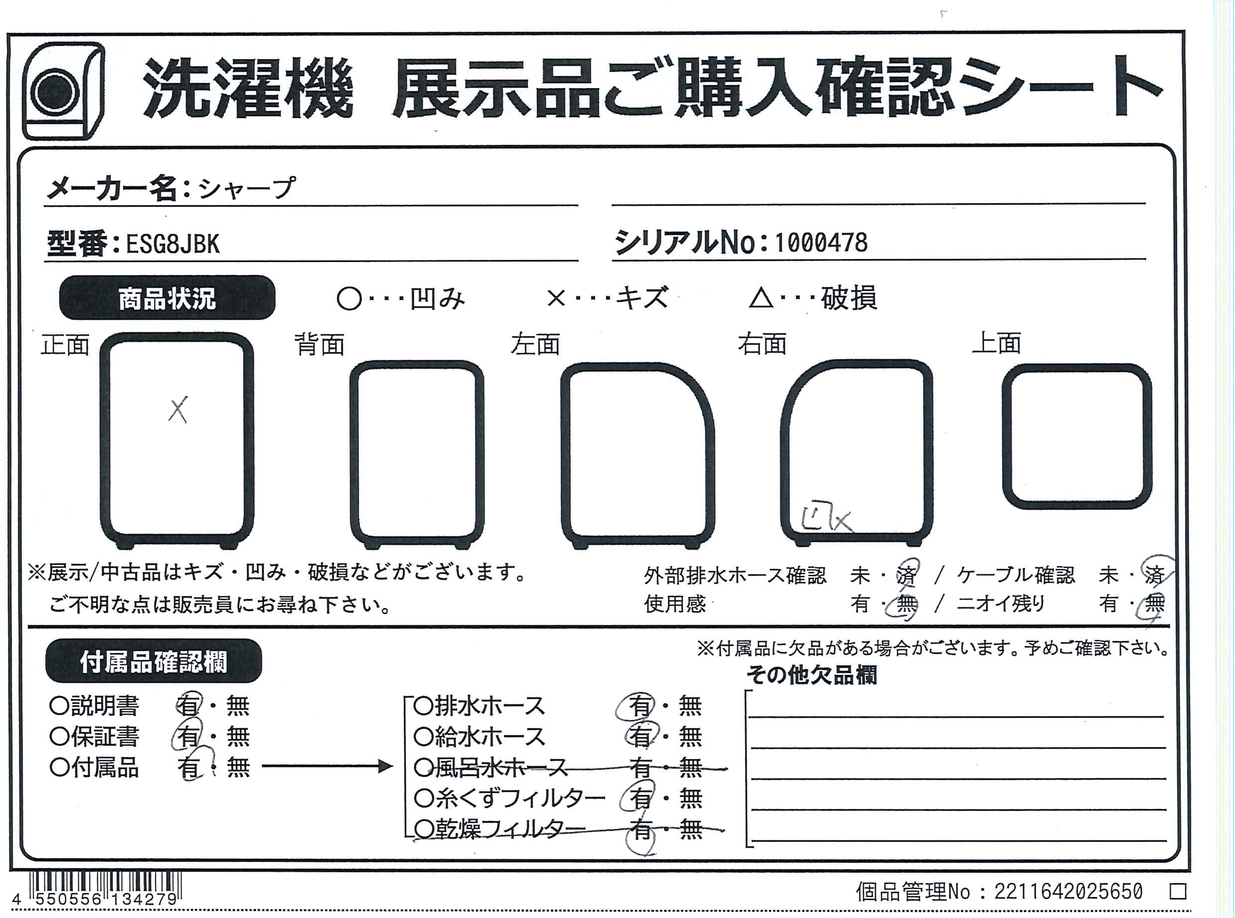 中古商品ランクについて 付属品・商品状態について 〔付属品〕取扱説明書、据付チラシ、底カバー取付説明書、給水ホース、水栓つぎて、底カバー、底カバー取付ねじ×6、脚スペーサー6ミリ×2、接着テープ×2、糸くずフィルター