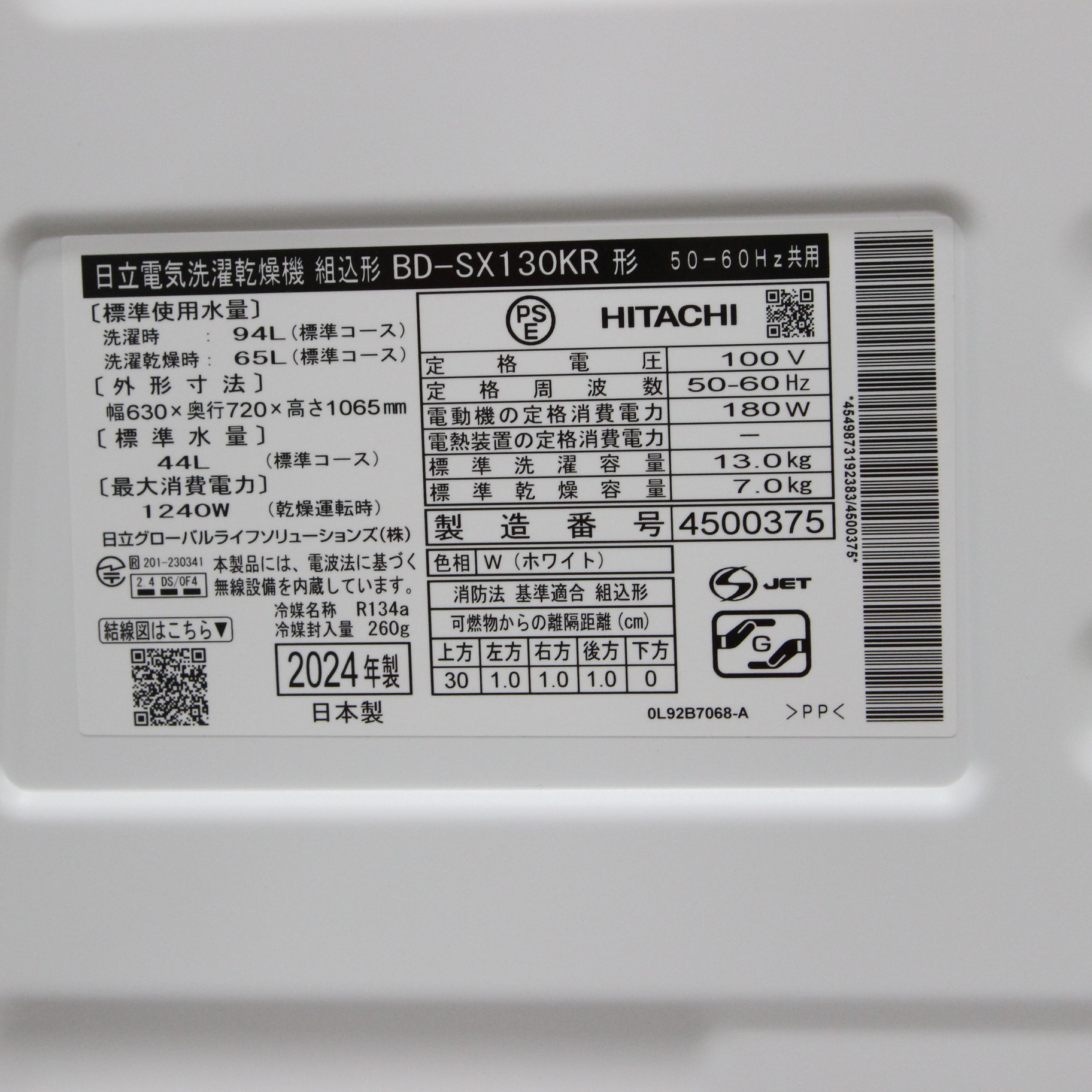 運転時間[洗濯〜乾燥時] 93分