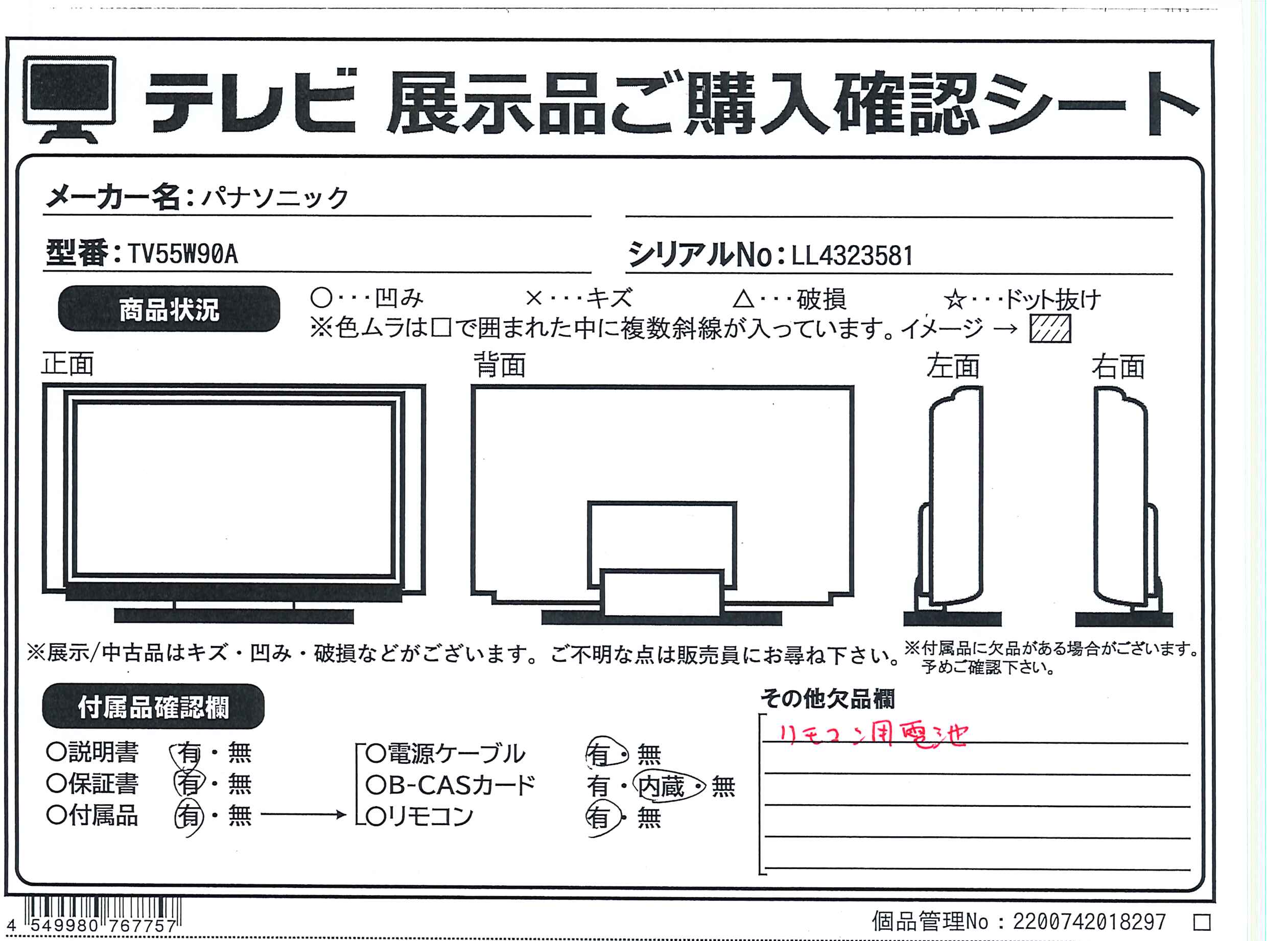 中古商品ランクについて 付属品・商品状態について 〔付属品〕説明書、スタートガイド、リモコン、電源コード、スタンド一式、クランパー×2、転倒・落下防止部品一式