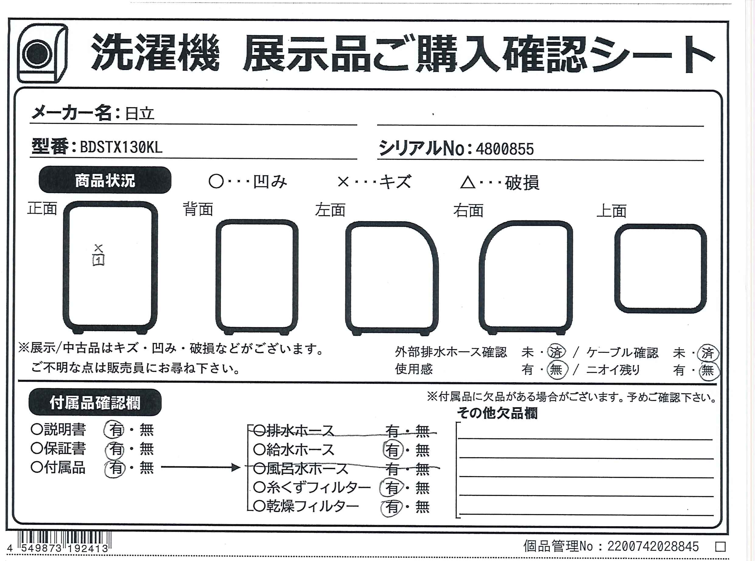 中古商品ランクについて 付属品・商品状態について 〔付属品〕取扱説明書、据付説明書、給水ホース(約0.8m)、カバー×4、輸送用ボルト×4