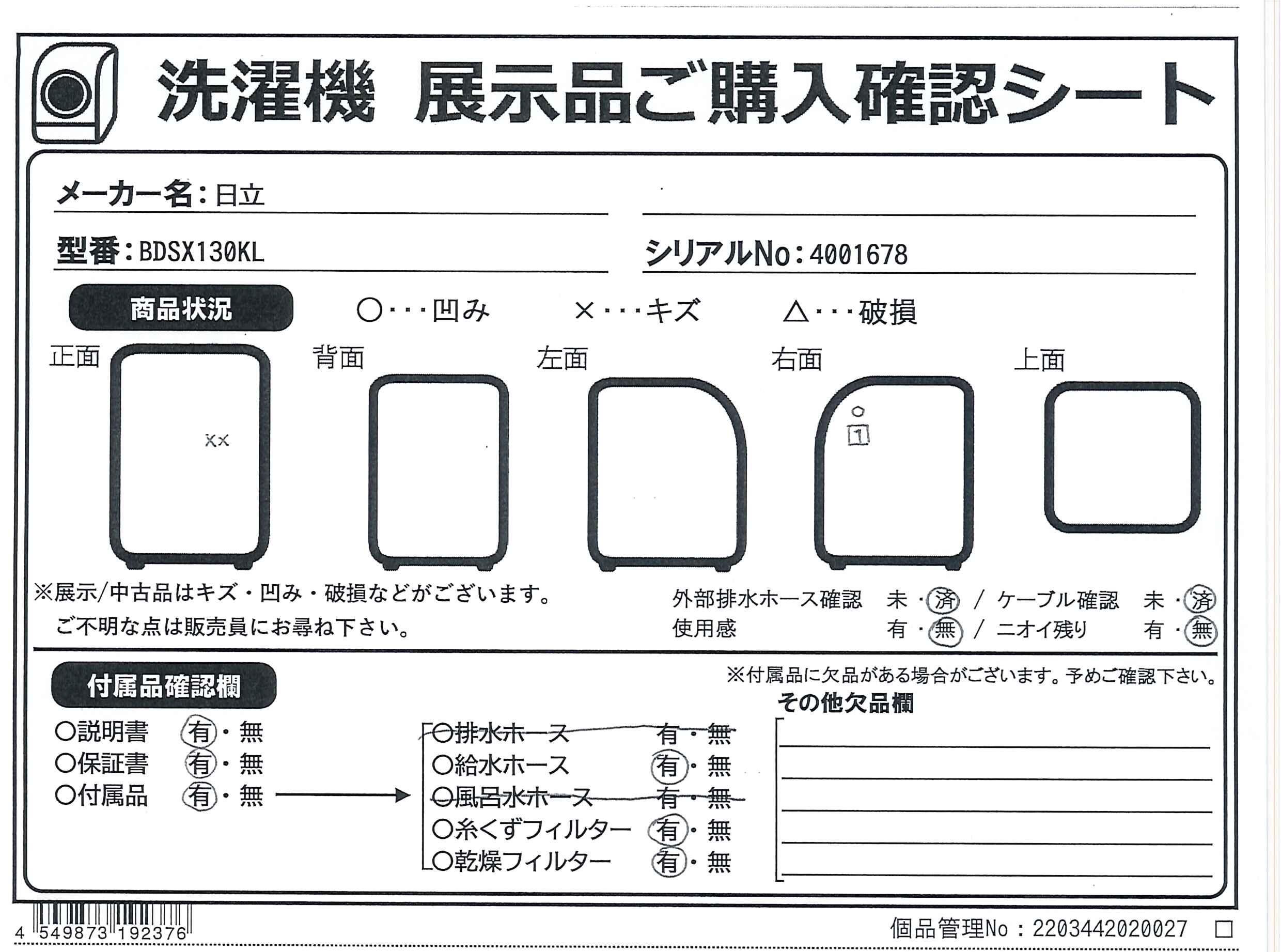 中古商品ランクについて 付属品・商品状態について 〔付属品〕取扱説明書、給水ホース、カバー×4、輸送用ボルト×4、据付説明書・据付チェックシート