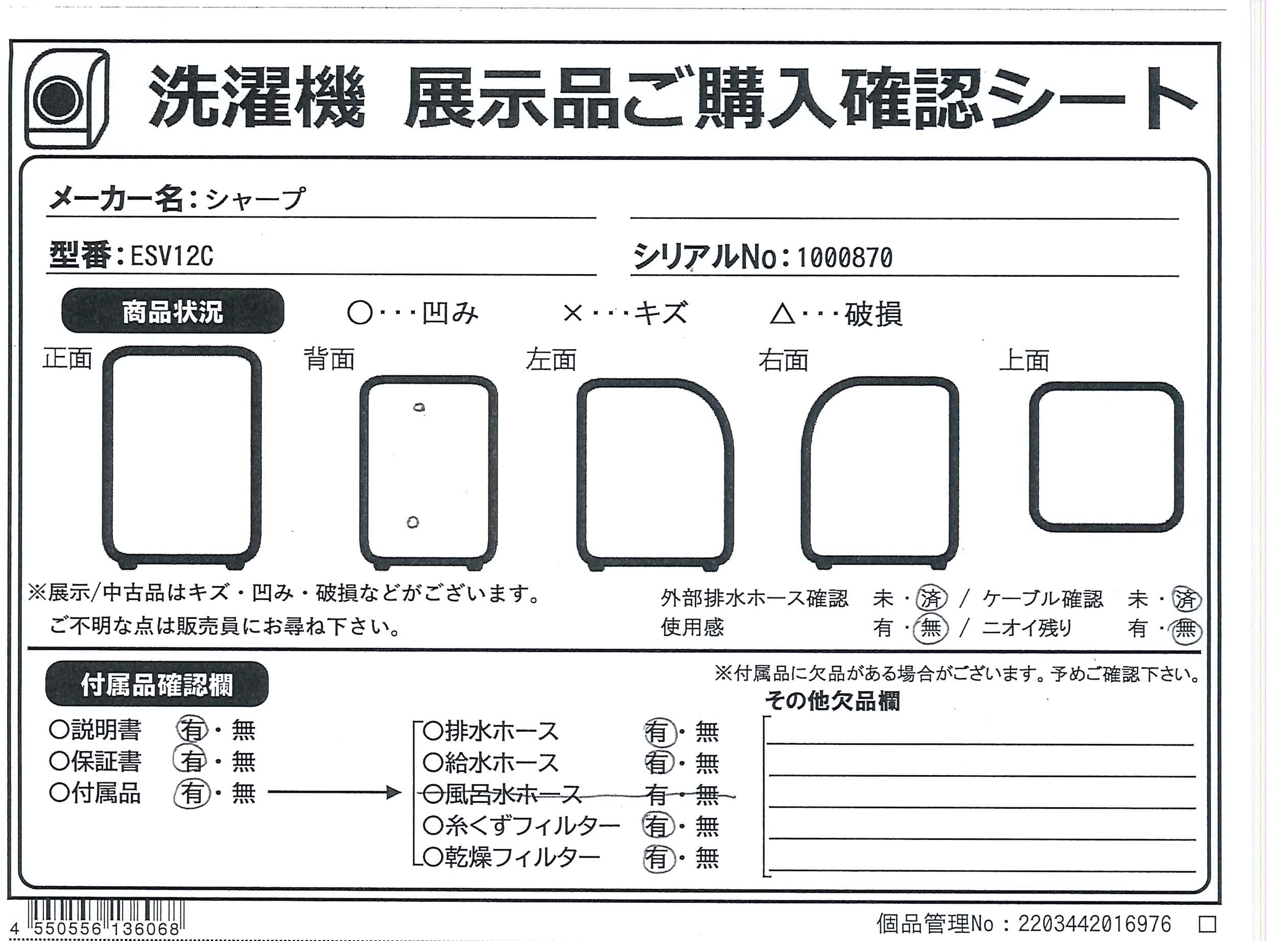 中古商品ランクについて 付属品・商品状態について 〔付属品〕取扱説明書、シャープクラウドサービスガイド、洗剤ご使用ガイド、据付チラシ、洗濯キャップ、給水ホース、外部ホース、水準器、輸送用固定ねじ4本、ビスシート(2枚入×2組)