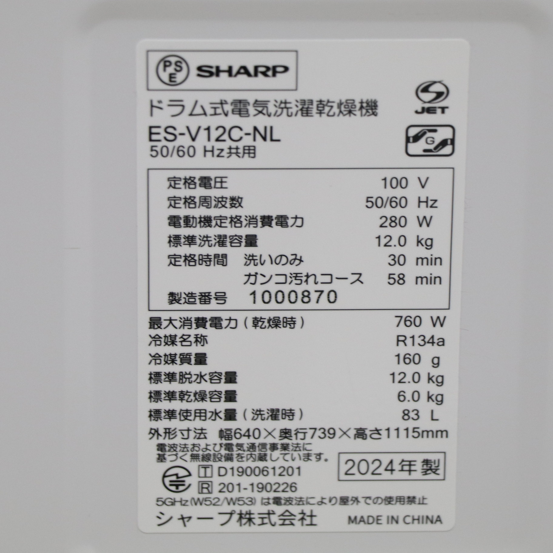 〔展示品〕 ドラム式洗濯機 アッシュゴールド ES-V12C-NL [洗濯12.0kg /乾燥6.0kg /ヒートポンプ乾燥 /左開き]