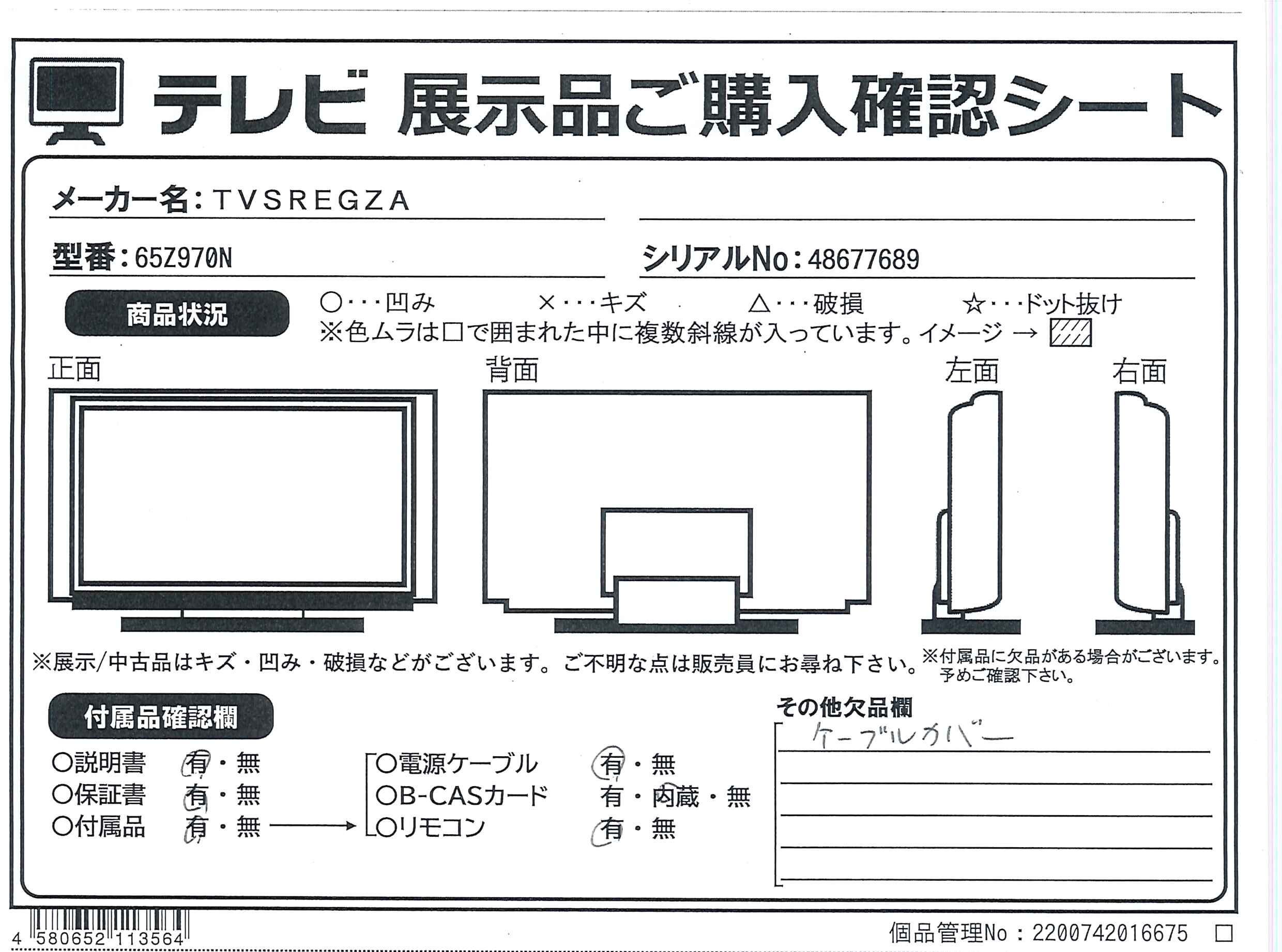 中古商品ランクについて 付属品・商品状態について 〔付属品〕説明書、スタンド一式、転倒防止バンド一式、リモコン、単四型乾電池×2、電源コード、スタンドカバー、組立ネジX2