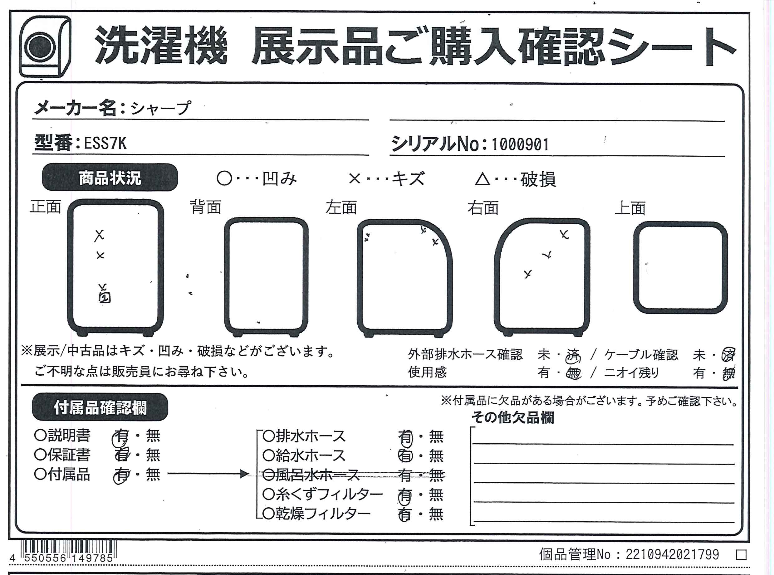 中古商品ランクについて 付属品・商品状態について 〔付属品〕説明書、据付チラシ、給水ホース、水栓つぎて、排水ホース、ホースクリップ、水準器、輸送用固定ねじX2、スパナ、ビスシートX2、外槽カバー