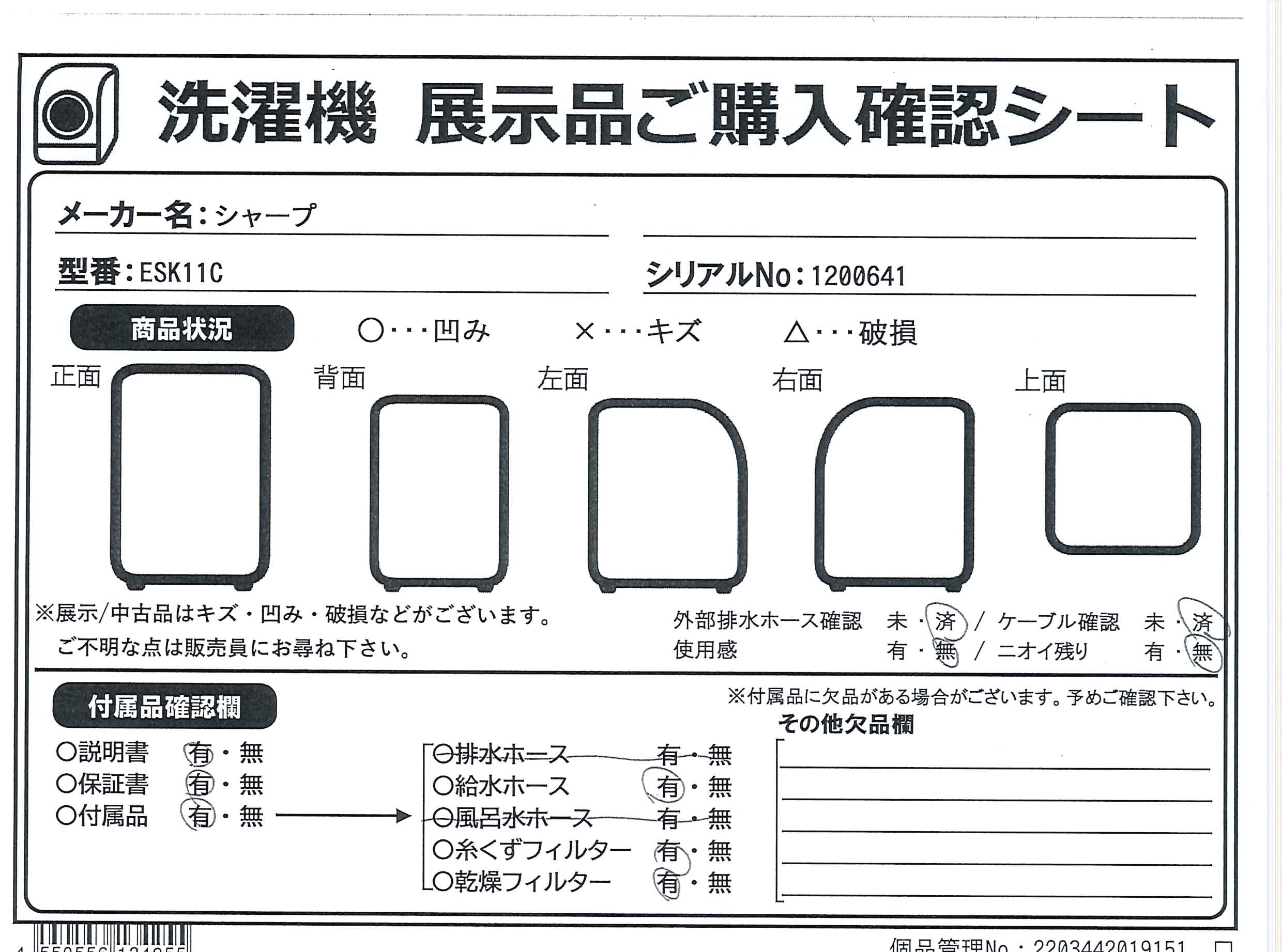 中古商品ランクについて 付属品・商品状態について 〔付属品〕取扱説明書、据付チラシ、給水ホース、水栓つぎて、水準器、輸送用固定ねじ2本、輸送用固定ねじ取り外しスパナ、ビスシート×2