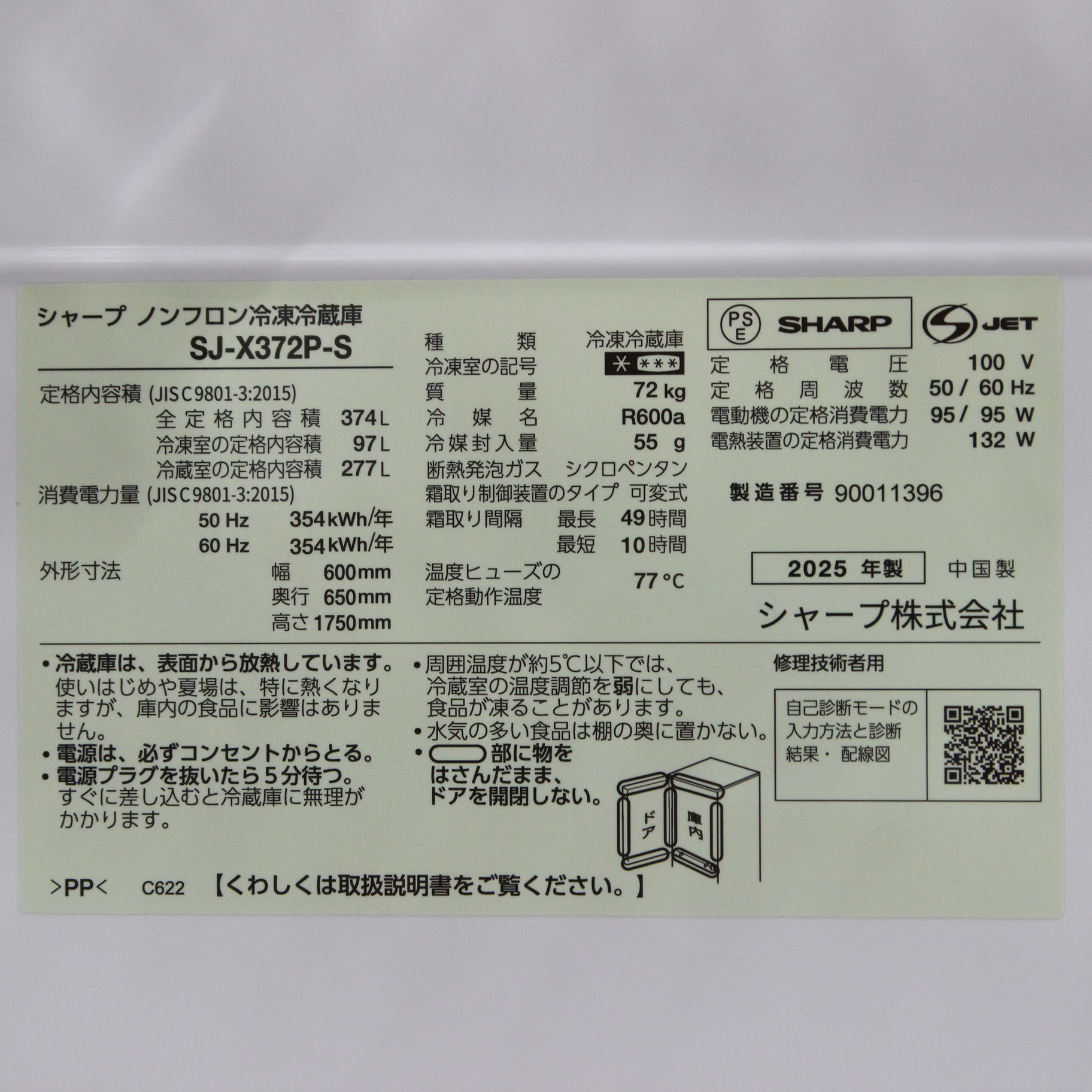 〔展示品〕 どっちもドア冷蔵庫 カームマットシルバー SJ-X372P-S [幅60cm /374L /3ドア /左右開きタイプ /2025年]
