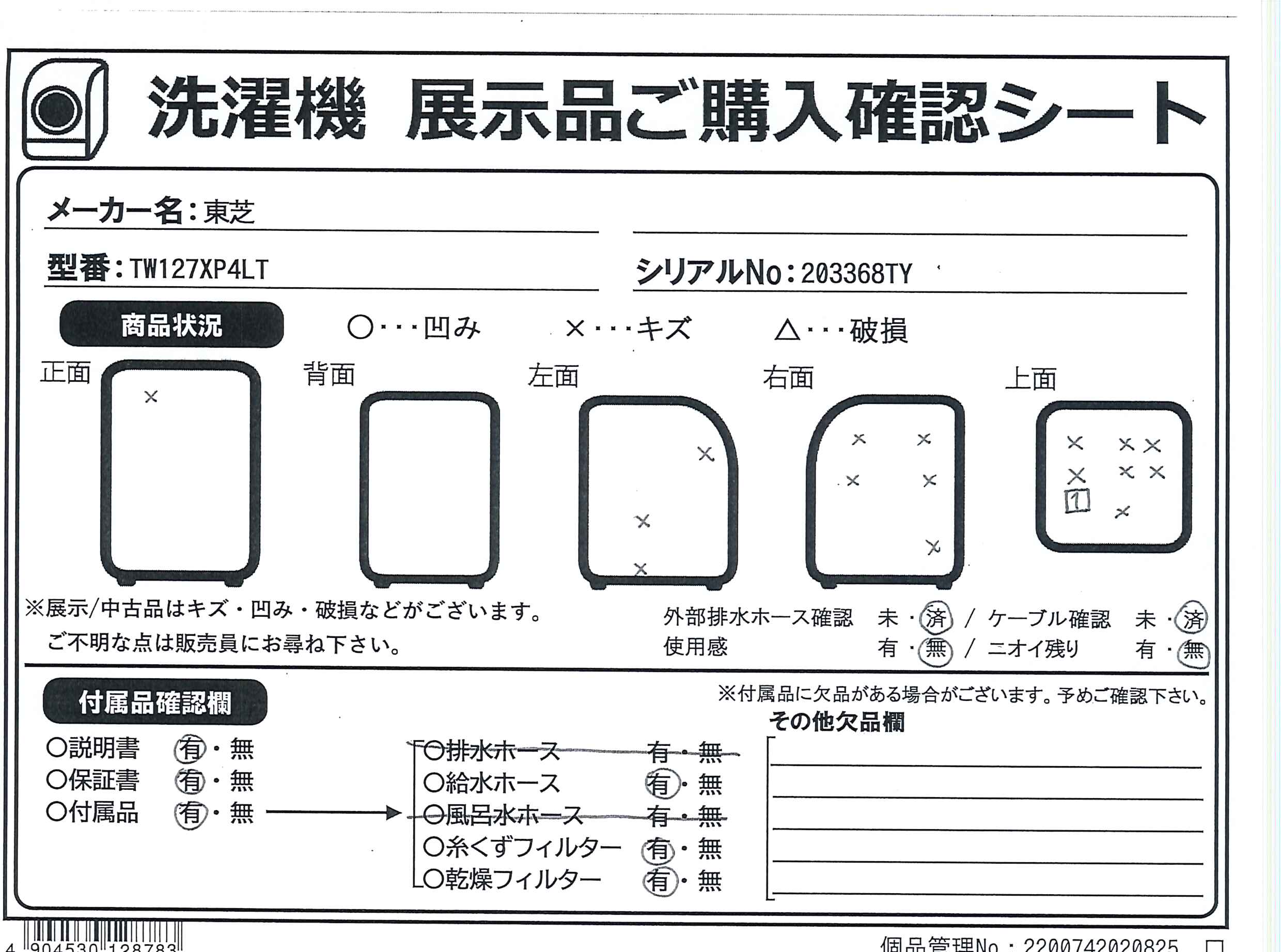 中古商品ランクについて 付属品・商品状態について 〔付属品〕取扱説明書、据付説明書、ご使用かんたんガイド、工具、安全カバー×4、ネジ×4、給水ホース、ホースキャップ、排水ホースバンド×2、ホース継手、お手入れブラシ