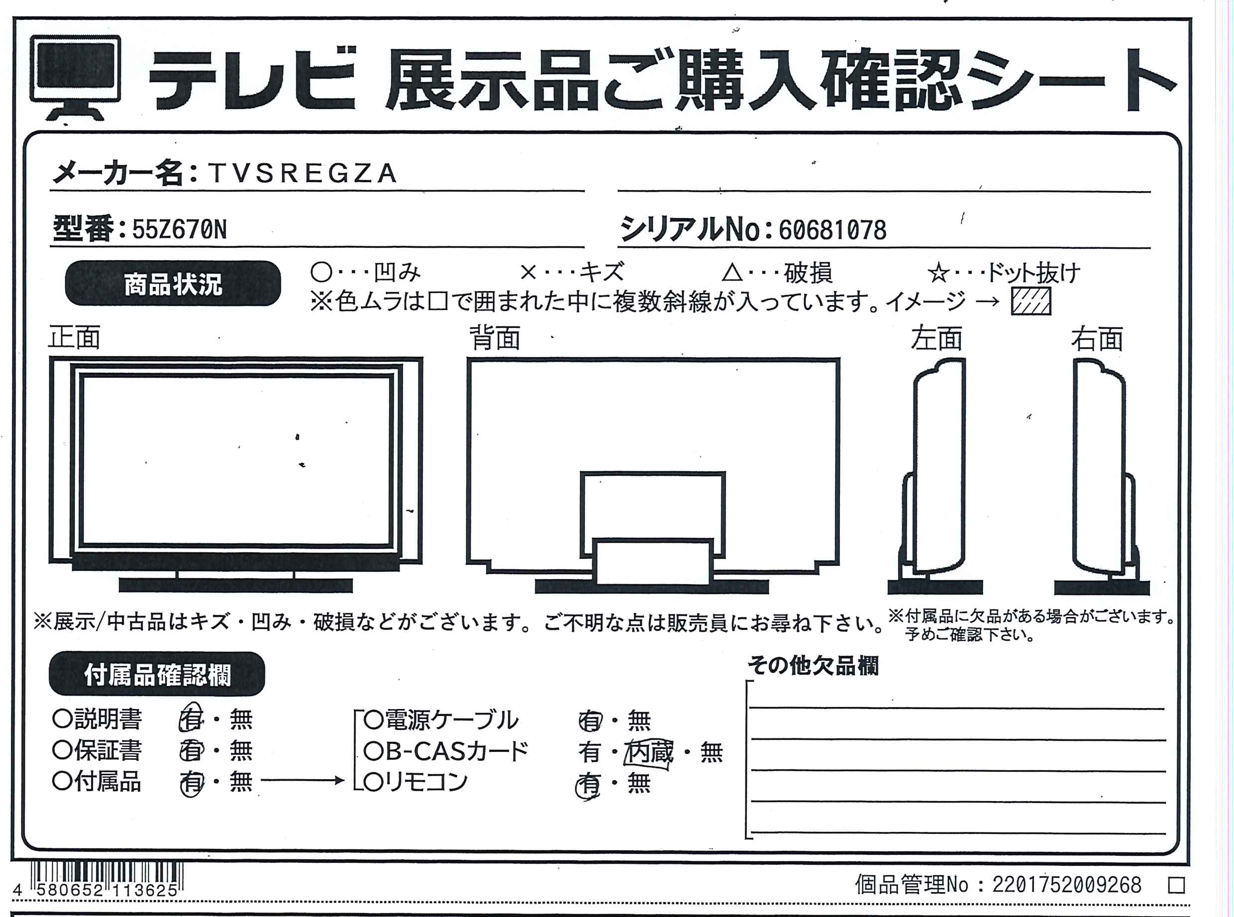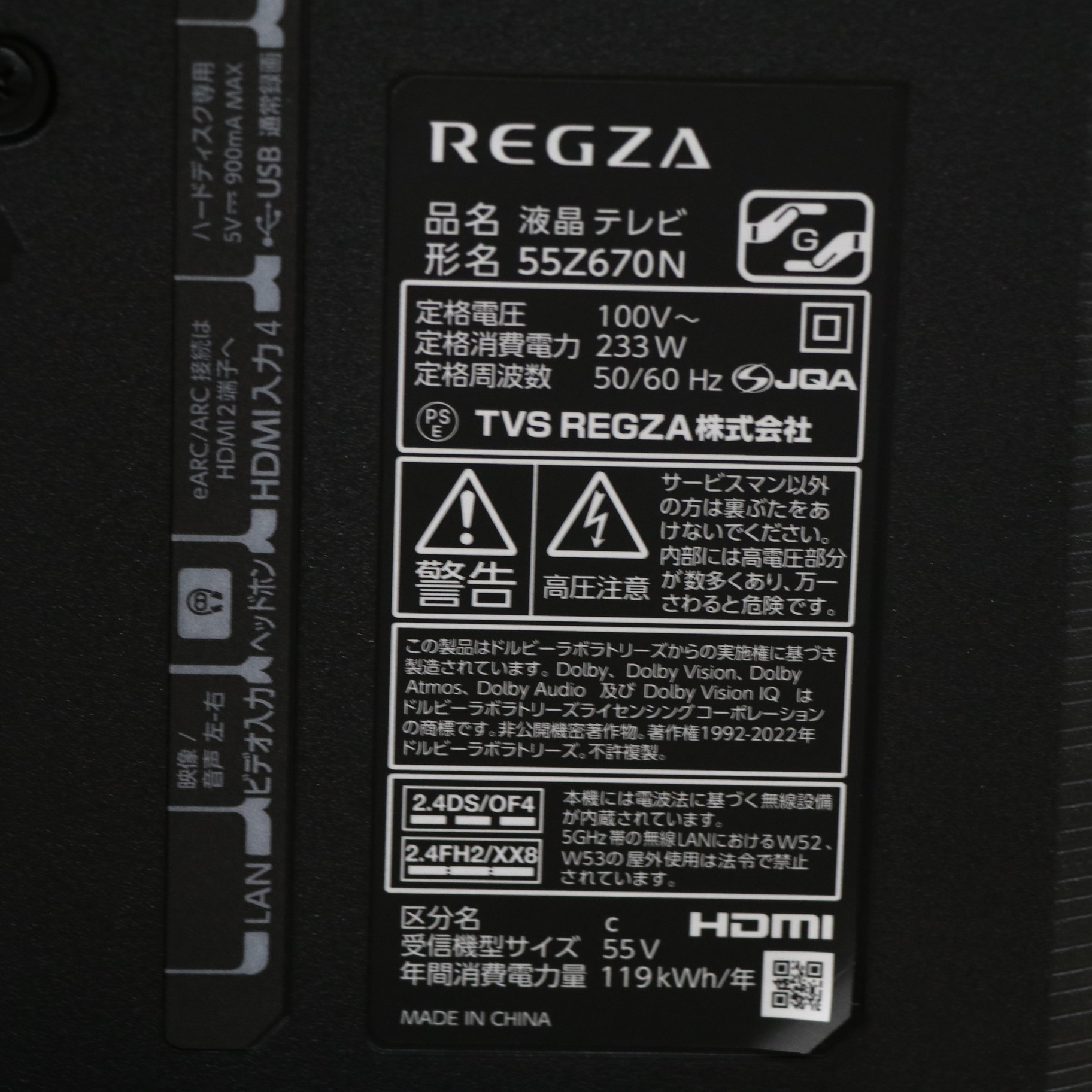 〔展示品〕 液晶テレビ REGZA(レグザ) 55Z670N [55V型 /Bluetooth対応 /4K対応 /BS・CS 4Kチューナー内蔵 /YouTube対応]