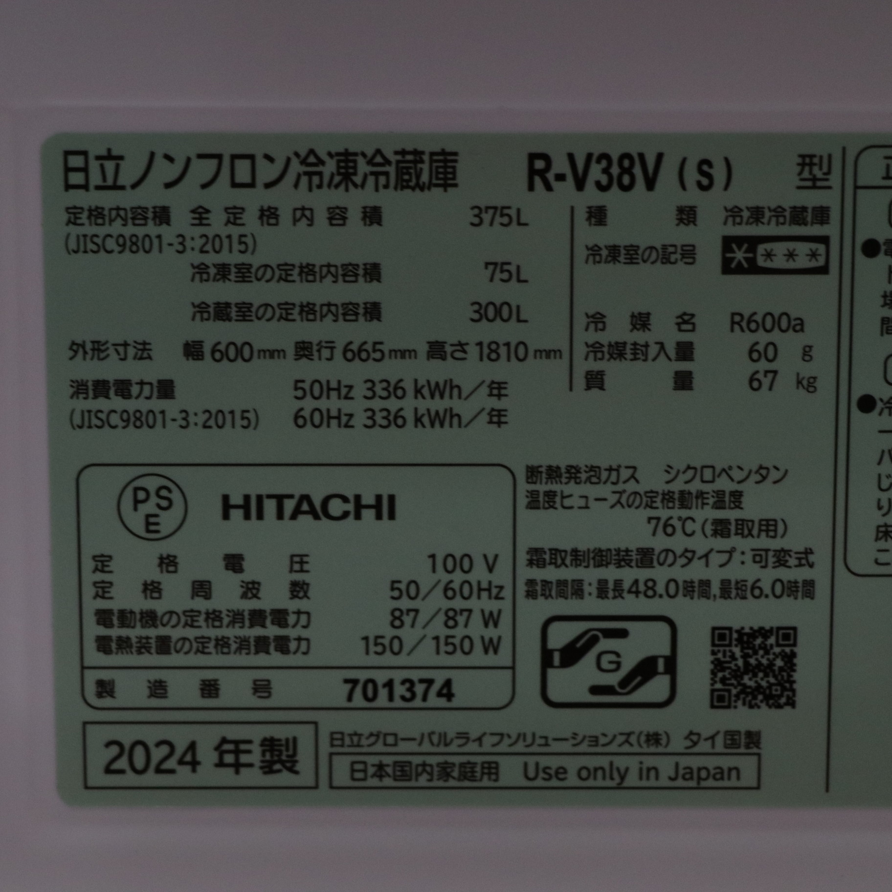 〔展示品〕 冷蔵庫 Vタイプ グラファイトシルバー R-V38V-S [幅60cm /375L /3ドア /右開きタイプ /2024年]