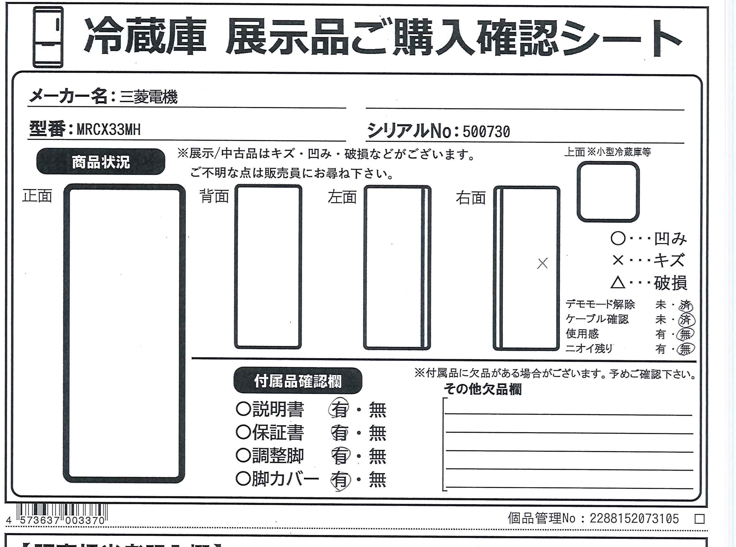 中古商品ランクについて 付属品・商品状態について 〔付属品〕説明書、ガラスシェルフ、ワン・ツー棚、ワイドチルドケース、氷点下ストッカーケース、給水タンク(浄水フィルターつき)、フリーポケット(大)、フリーポケット(小)、ボトルポケット、フリーケース(タマゴトレイつき)、野菜ケース、野菜小物ケース、フリージングケース(上)、フリージングケース(下)、防音マット、アイスサーバー、脚カバー