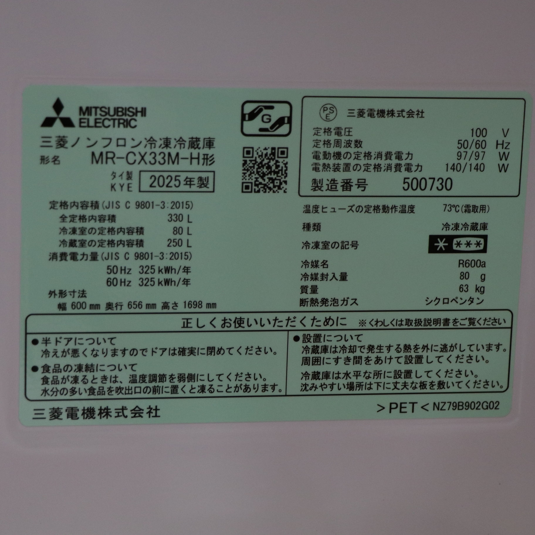 〔展示品〕 三菱冷蔵庫CXシリーズ 三菱冷蔵庫CXシリーズ マットアンバーグレー MR-CX33M-H [60(cm) /330L /3ドア /右開きタイプ /2025年]