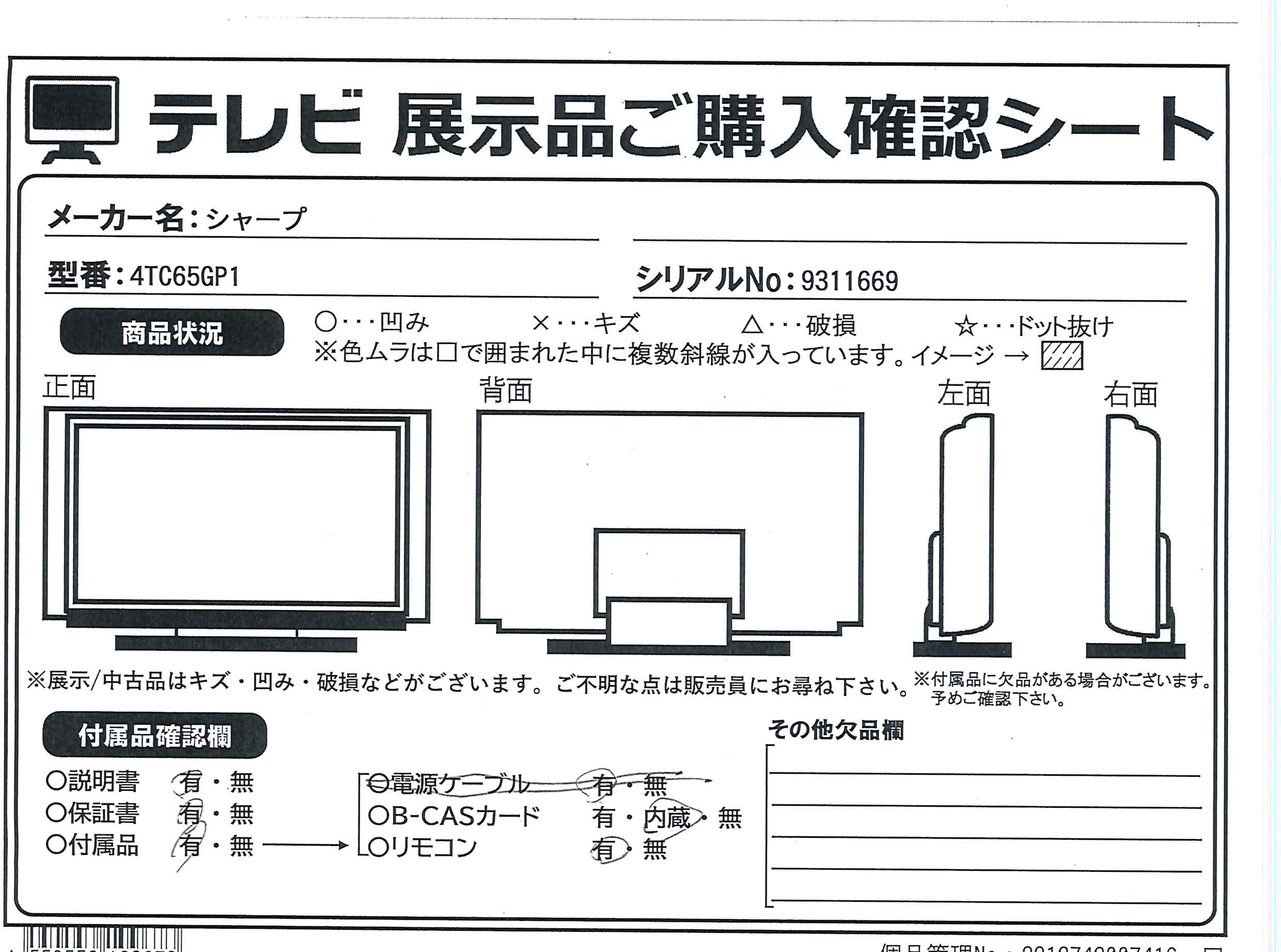 中古商品ランクについて 付属品・商品状態について 〔付属品〕取扱説明書、かんたん使い方ガイド、リモコン、リモコン用乾電池×2、スタンド取付金具、スタンドカバー、スタンドベース、スタンド組立用ネジ×4、スタンド取付用ネジ×4、転倒防止ベルト、転倒防止ベルトテレビ取付用ネジ、転倒防止ベルトテレビ台固定用ネジ、スタンド回転ロックネジ