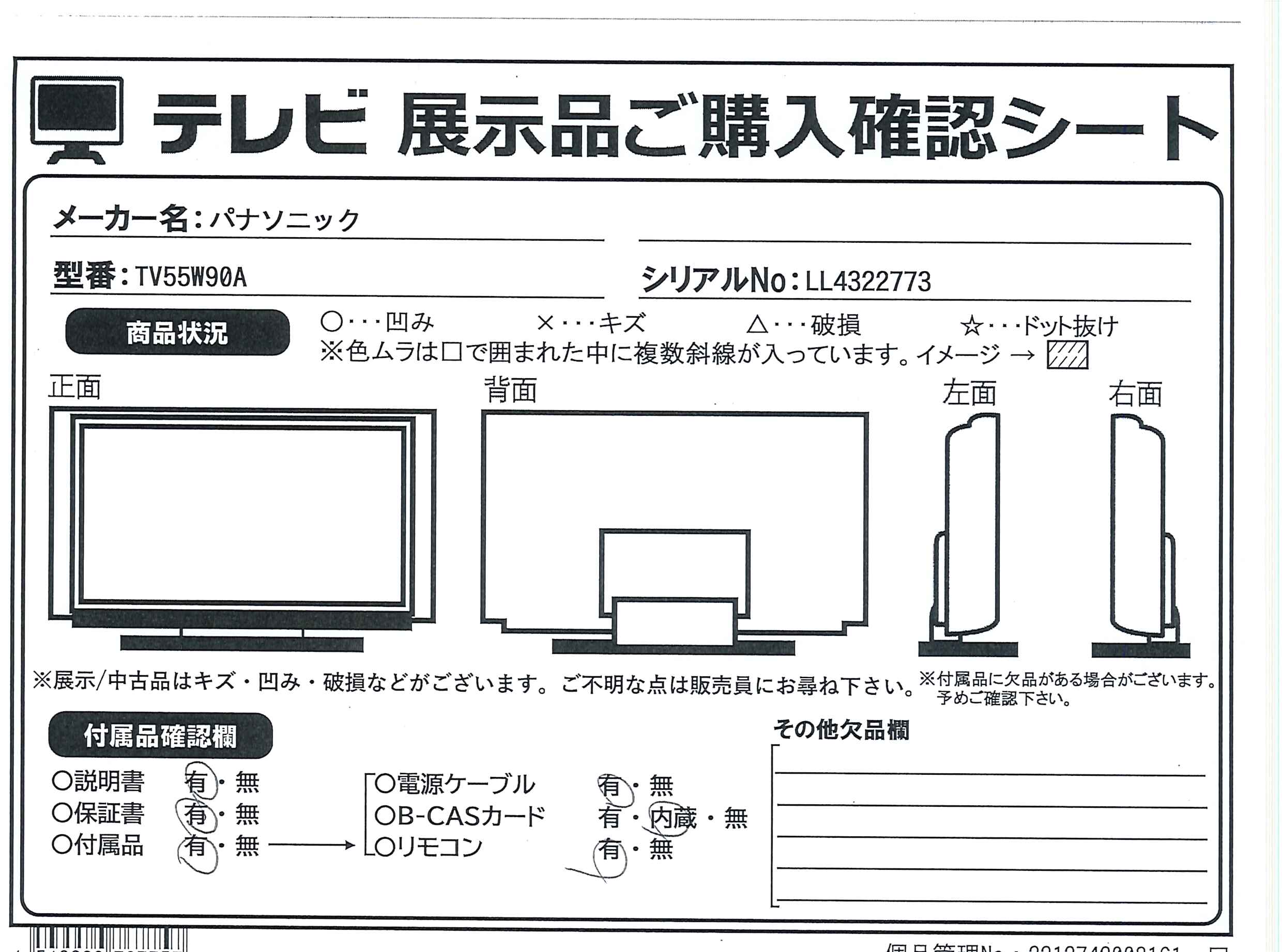 中古商品ランクについて 付属品・商品状態について 〔付属品〕説明書、スタートガイド、リモコン、リモコン用乾電池×2、電源コード、スタンド一式、クランパー×2、転倒・落下防止部品一式