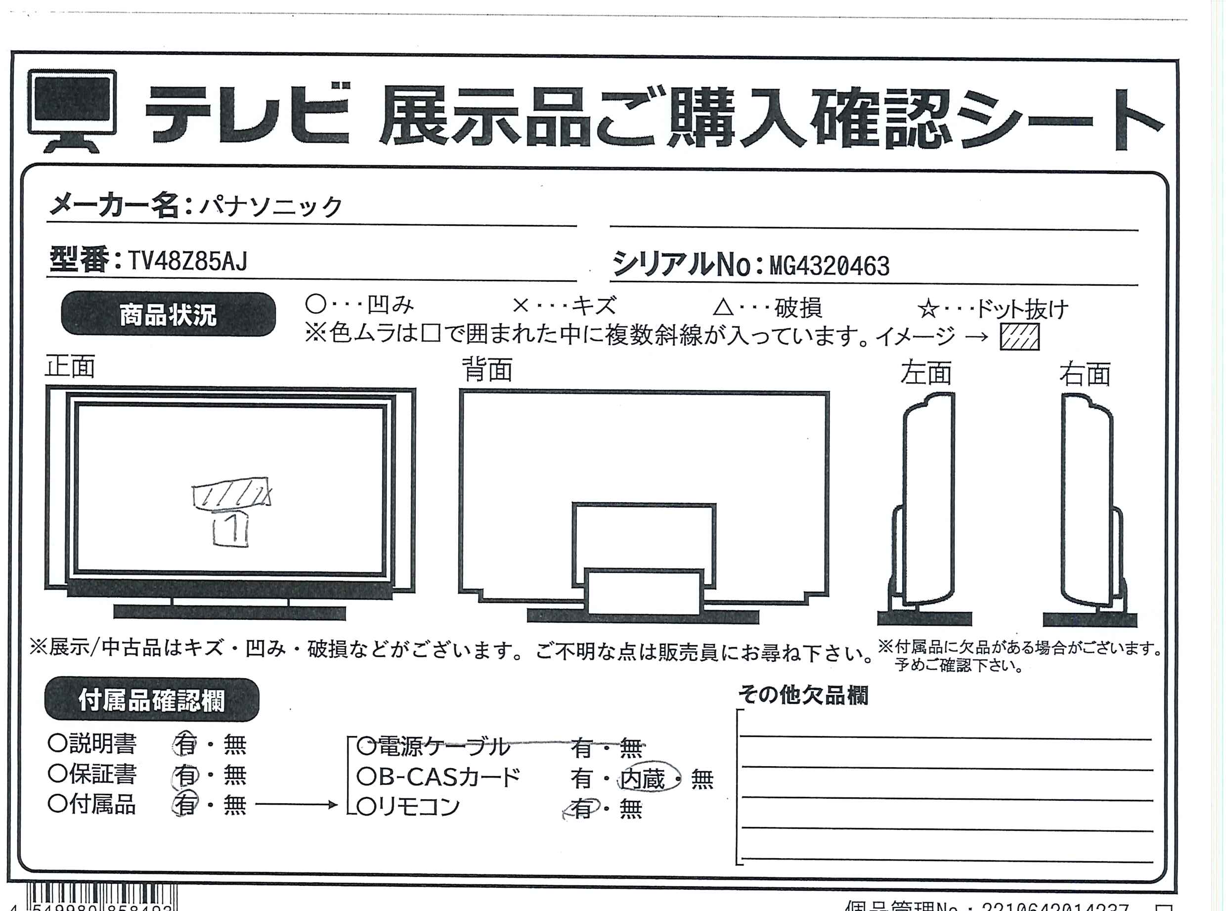 中古商品ランクについて 付属品・商品状態について 〔付属品〕取扱説明書、スタートガイド、リモコン、リモコン用単4形乾電池×2、組み立て部品一式、転倒・落下防止部品一式