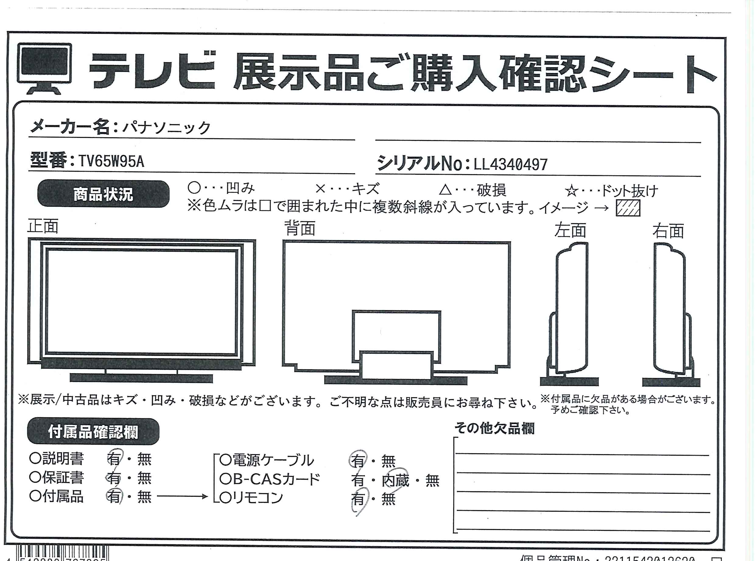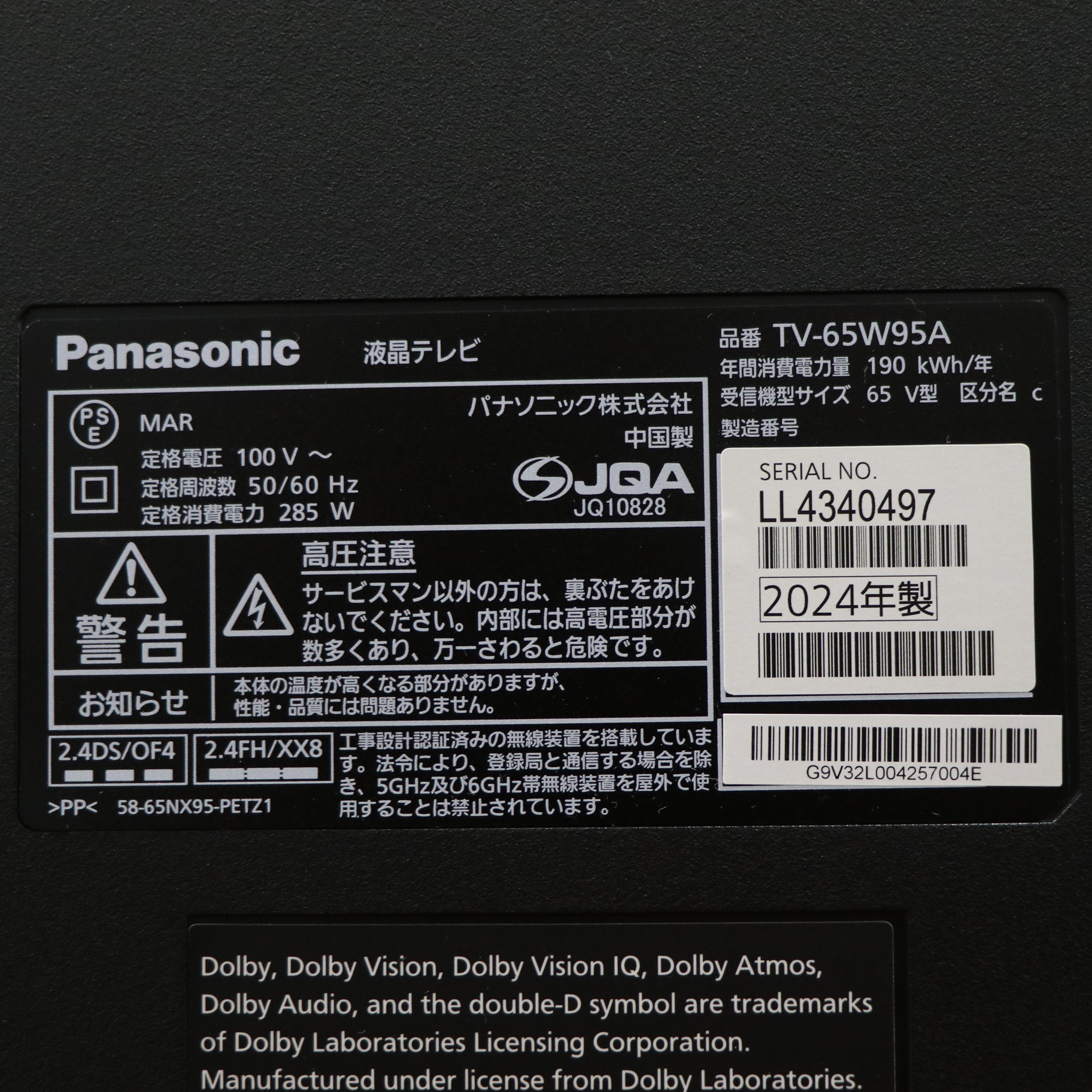 〔展示品〕 液晶テレビ VIERA(ビエラ) TV-65W95A [65V型 /Bluetooth対応 /4K対応 /YouTube対応]