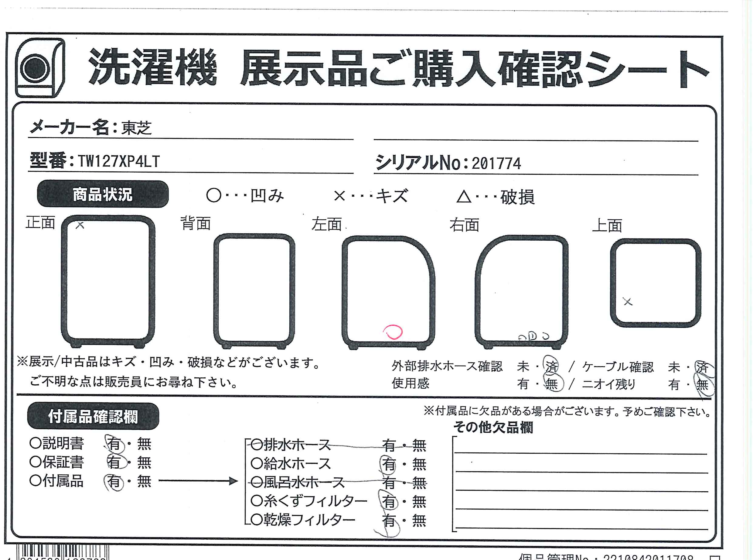 中古商品ランクについて 付属品・商品状態について 〔付属品〕取扱説明書、据付説明書、ご使用かんたんガイド、工具、安全カバー×4、ネジ×4、給水ホース、ホースキャップ、排水ホースバンド×2、ホース継手、お手入れブラシ