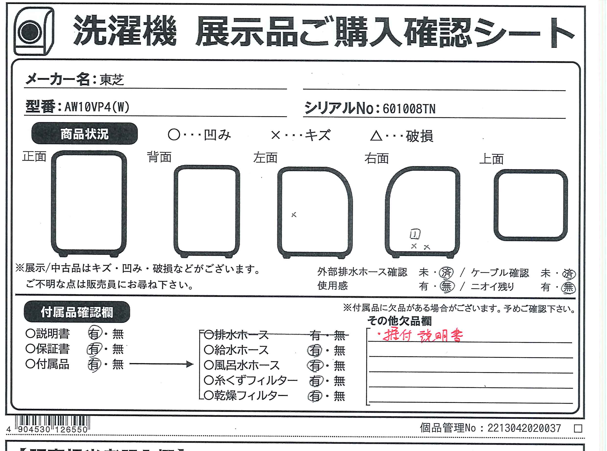 中古商品ランクについて 付属品・商品状態について 〔付属品〕取扱説明書、据付説明書、給水ホース、ふろ水用給水ホース フィルター付き、保護カバー、おしゃれ着トレー