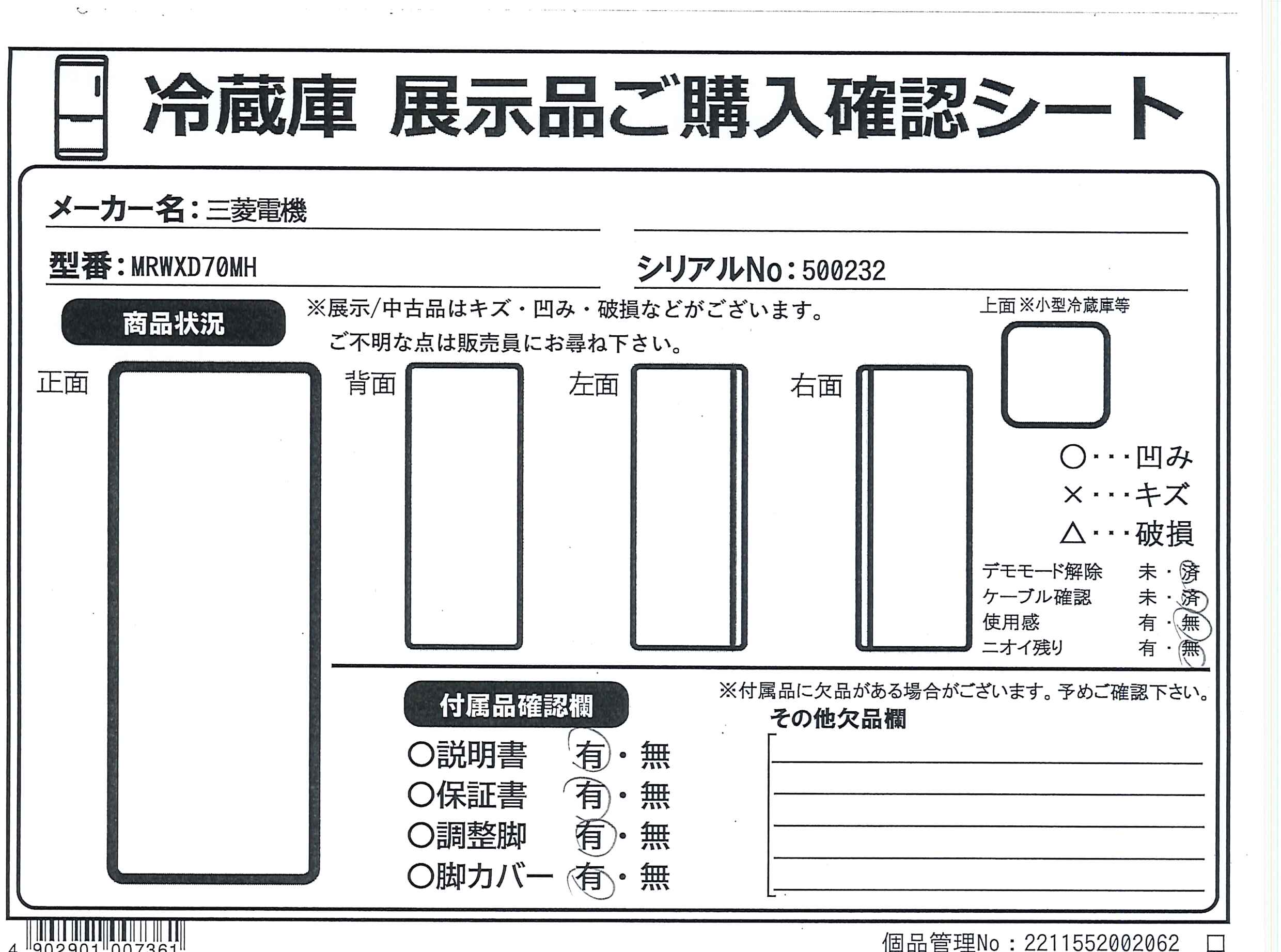 中古商品ランクについて 付属品・商品状態について 〔付属品〕取扱説明書、ガラスシェルフ(上)、ガラスシェルフ(中)、ガラスシェルフ(下)、仕切り、スライドシェルフ(前)、スライドシェルフ(奥)、ワイドチルドケースフタ、ワイドチルドケース、氷点下ストッカーケース、給水タンク(カルキクリーンフィルターつき)、チェンジポケット(大)×2、チェンジポケット(小)×2、フリータマゴケース、タマゴトレイ、ボトルポケット(大)、ボトルポケット(小)、フリーケース(小)、ストッパー、製氷皿、貯氷箱、防音マット、アイスサーバー、瞬冷凍室ケース、アルミトレイ、フリージングケース(上)、フリージングケース(下)、野菜ケース、スライドケース、野菜ケース仕切り、調節脚、脚カバー、調整脚用工具セット