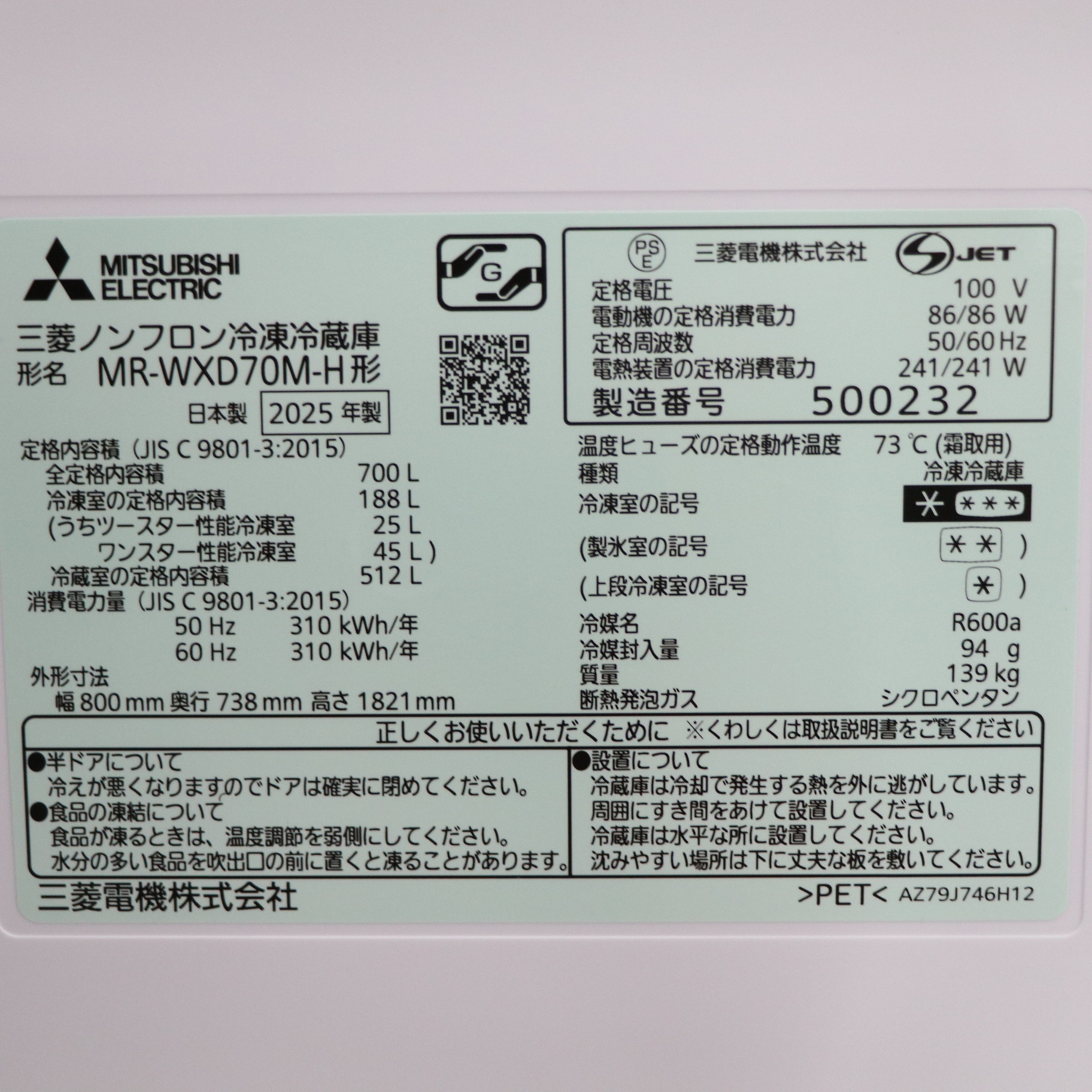 〔展示品〕 冷蔵庫 置けるスマート大容量 WXDシリーズ(プレミアムフレンチモデル) グランドアンバーグレー MR-WXD70M-H [幅80cm /700L /6ドア /観音開きタイプ /2025年]