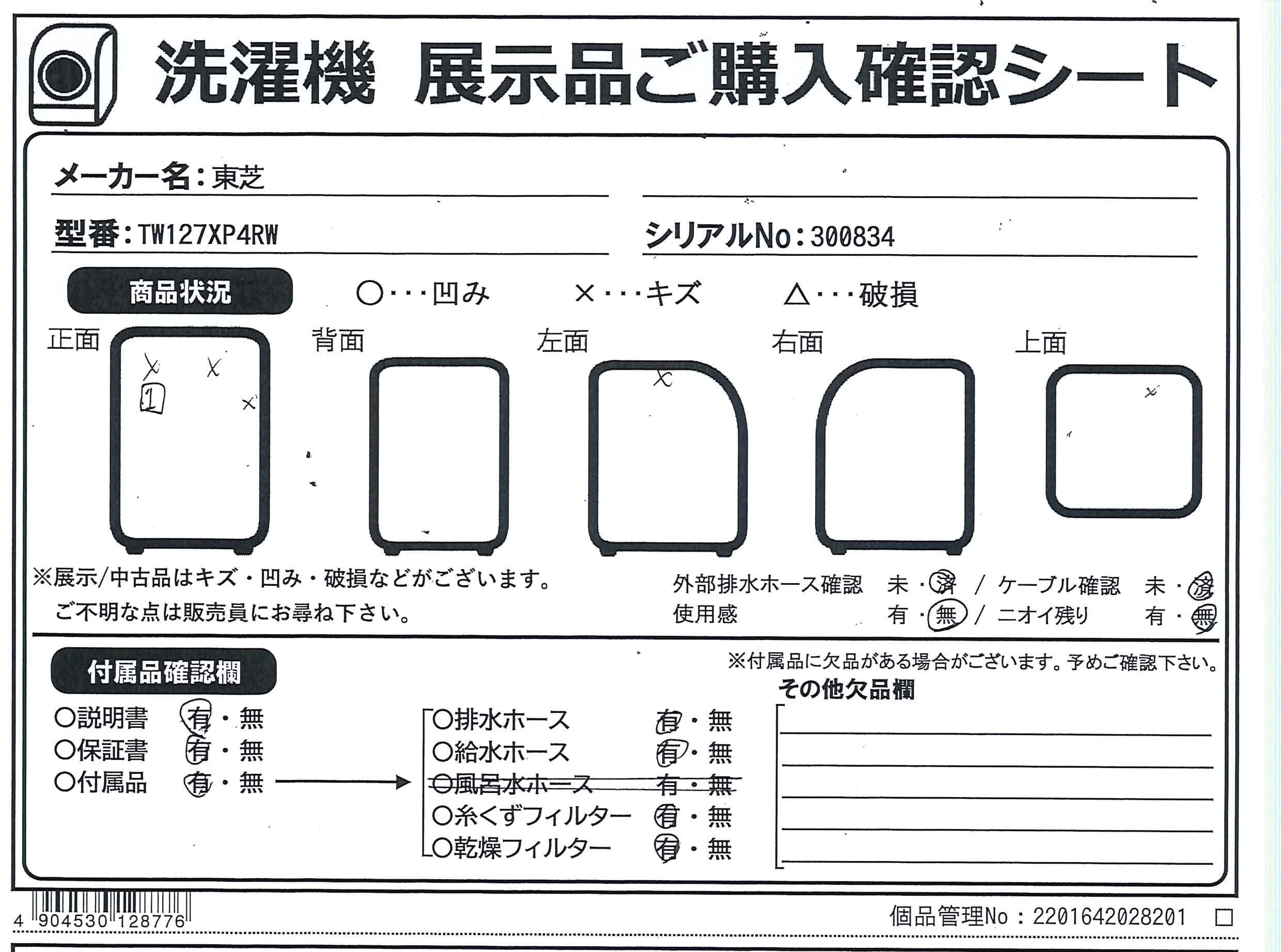 中古商品ランクについて 付属品・商品状態について 〔付属品〕取付説明書、据付説明書、工具、ねじセット(安全カバー付き・各4個)、給水ホース、ホースキャップ、排水ホースバンド×2、ホース継手、お手入れブラシ