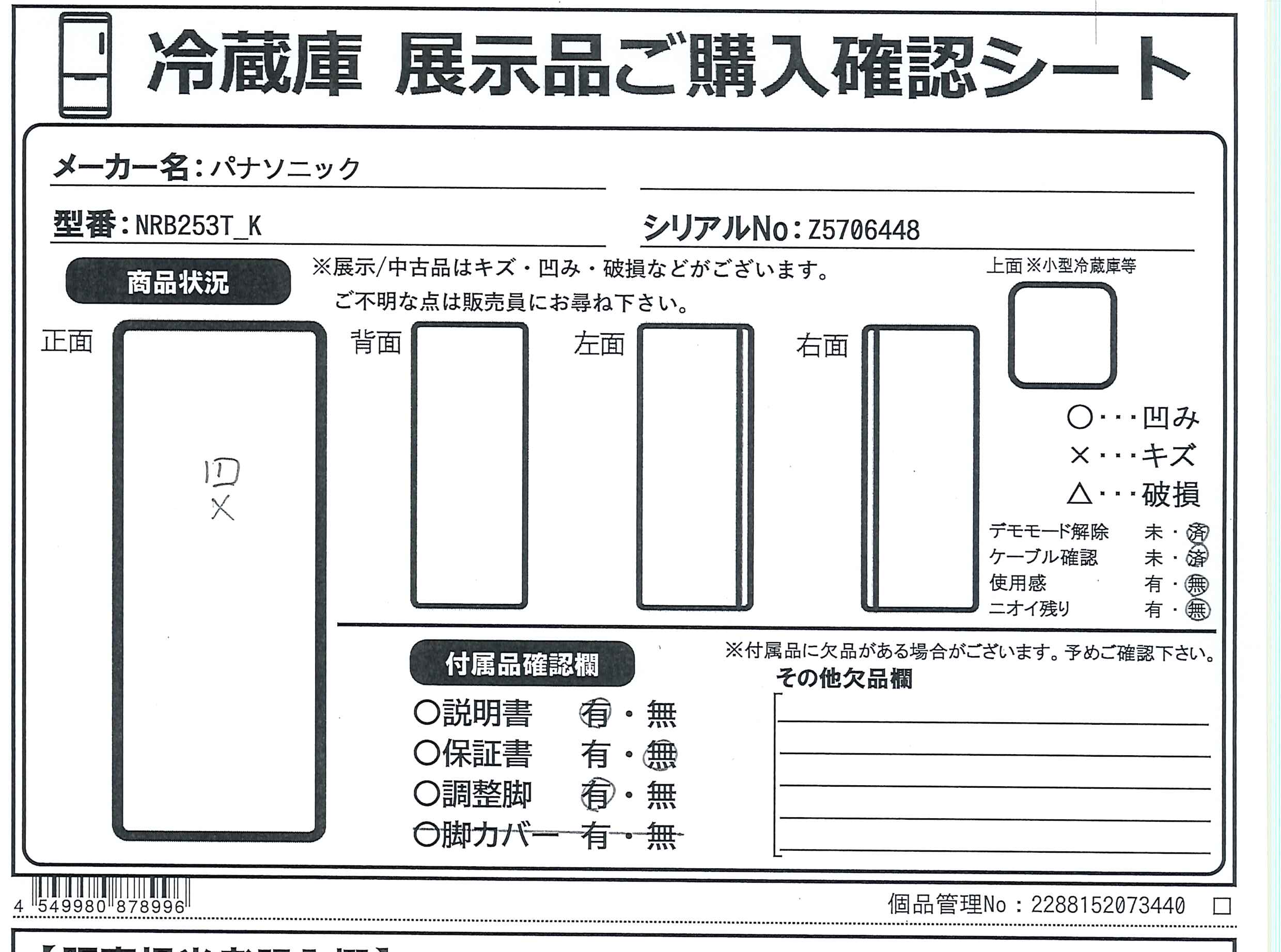 中古商品ランクについて 付属品・商品状態について 〔付属品〕説明書、調節脚、製氷皿、仕切りケース(貯氷箱)、卵トレイX2、蒸発皿