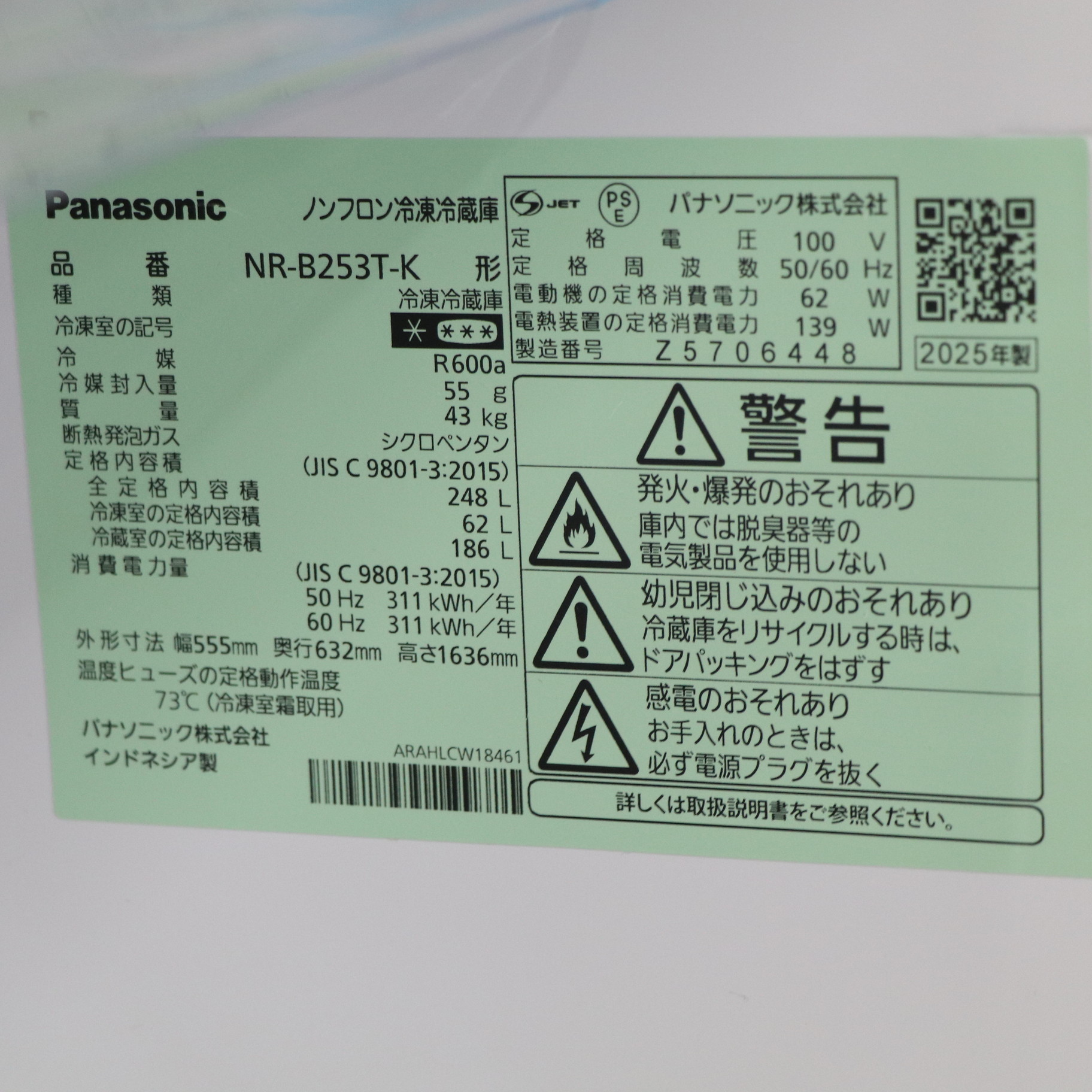 〔展示品〕 冷蔵庫 トップフリーザータイプ マットブラック NR-B253T-K [幅55.5cm /248L /2ドア /右開きタイプ /2025年]