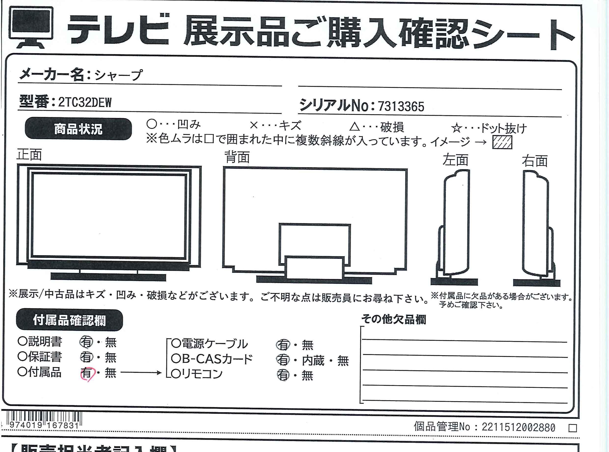 中古商品ランクについて 付属品・商品状態について 〔付属品〕取扱説明書、スタンド、スタンド取り付けネジ、リモコン、リモコン用単4形乾電池×2、mini B-CASカード、mini B-CASカード挿入口カバー、カバー専用ねじ