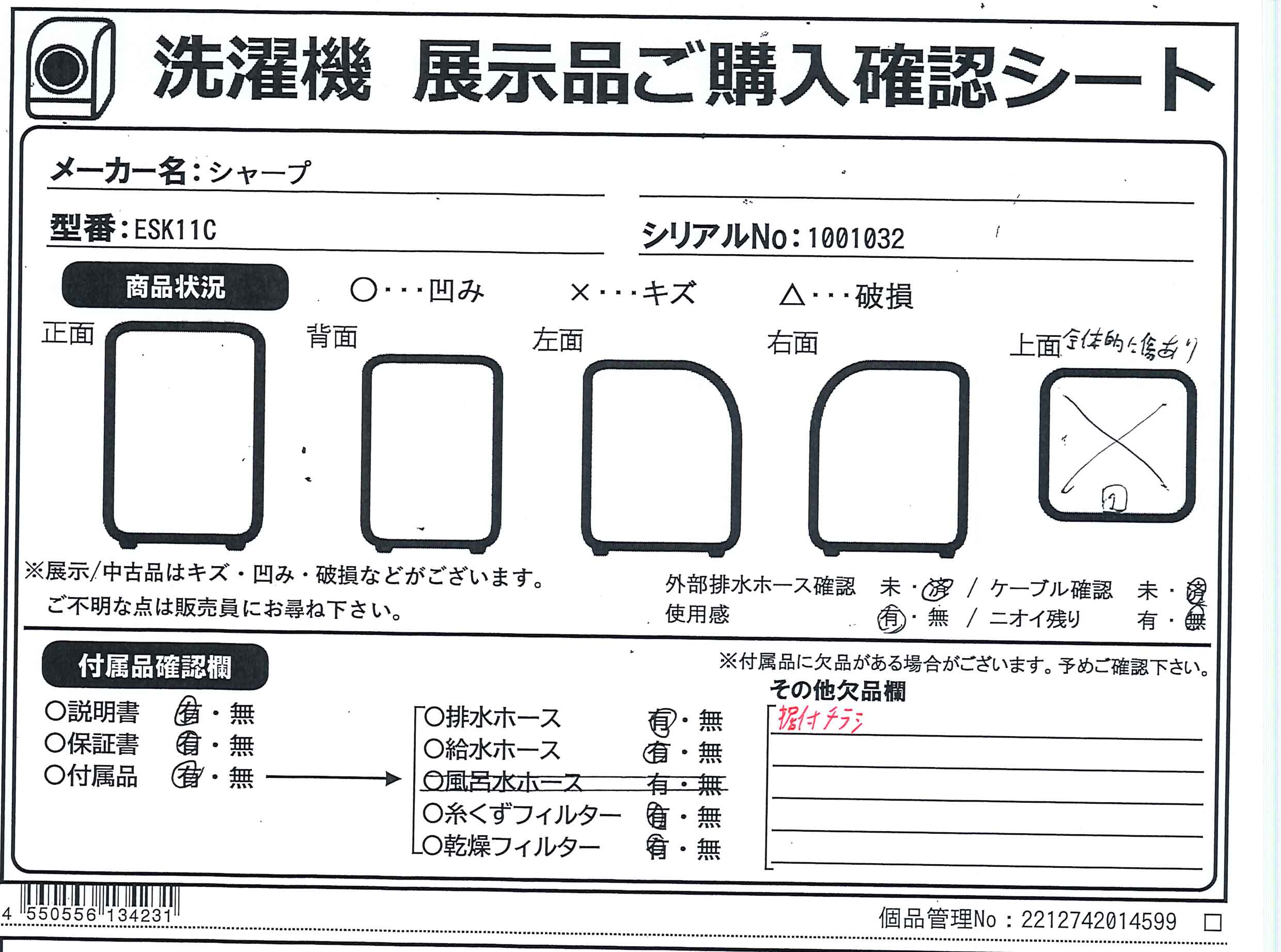 中古商品ランクについて 付属品・商品状態について 〔付属品〕取扱説明書、給水ホース、水準器、輸送用固定ねじ×2、輸送用固定ねじ取り外しスパナ、ビスシート