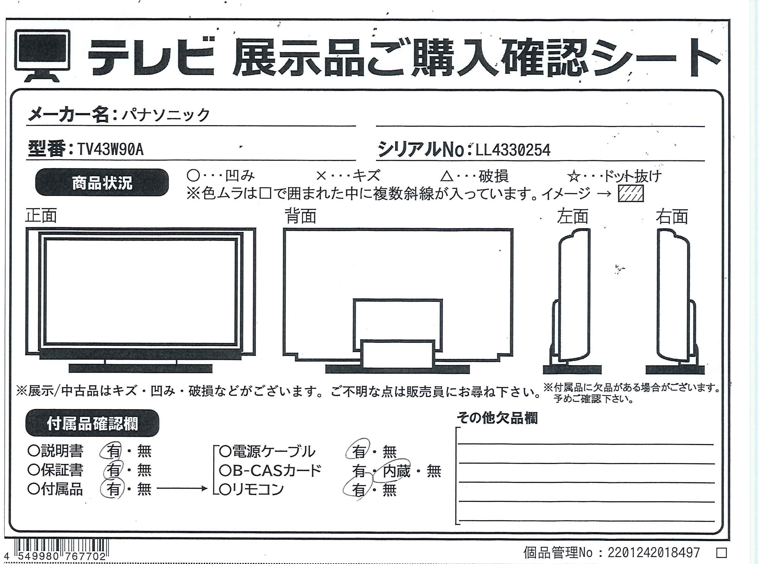 中古商品ランクについて 付属品・商品状態について 〔付属品〕取扱説明書、スタートガイド、リモコン(品番:N2QBYA000078)、単4形乾電池×2、電源コード、転倒防止スタンド、本体固定用ねじ(M5×20)×4、クランパー×2、ベルト、ねじ(ベルト用)黒、木ねじ 黒、金具×2、ねじ(金具用)黒×2