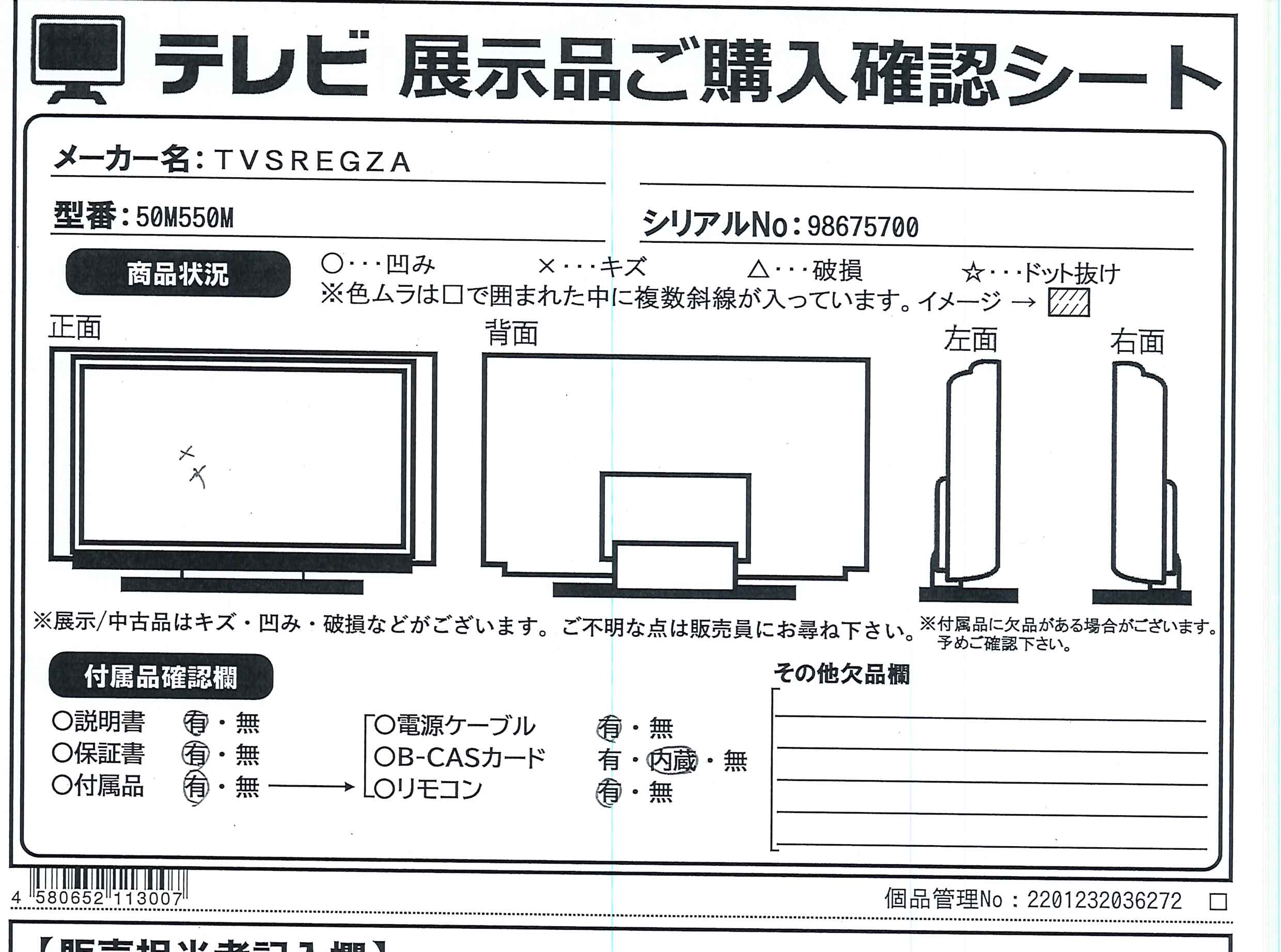 中古商品ランクについて 付属品・商品状態について 〔付属品〕説明書、スタンド一式、リモコン、単四形乾電池×2、電源コード、転倒防止バンド一式