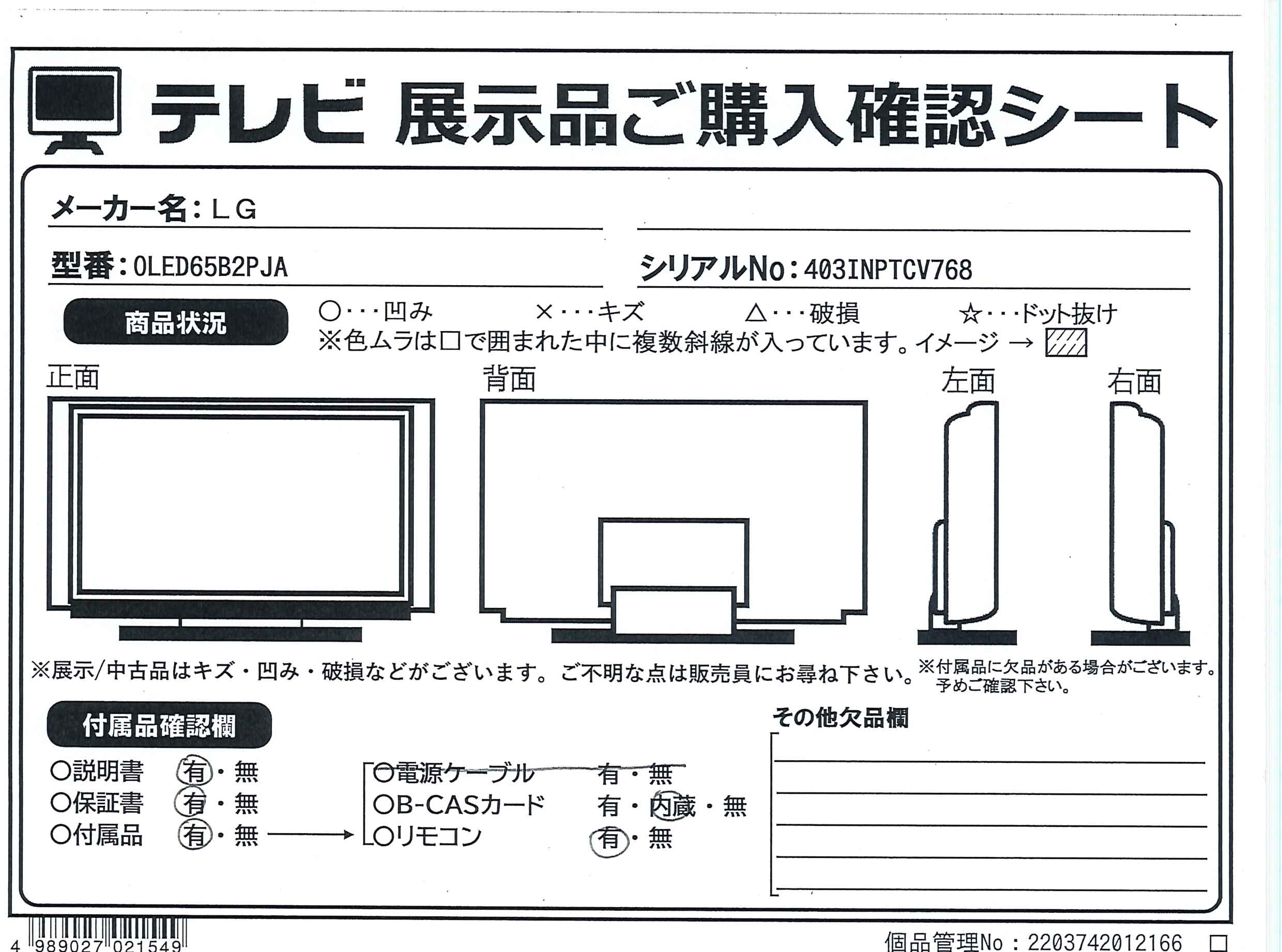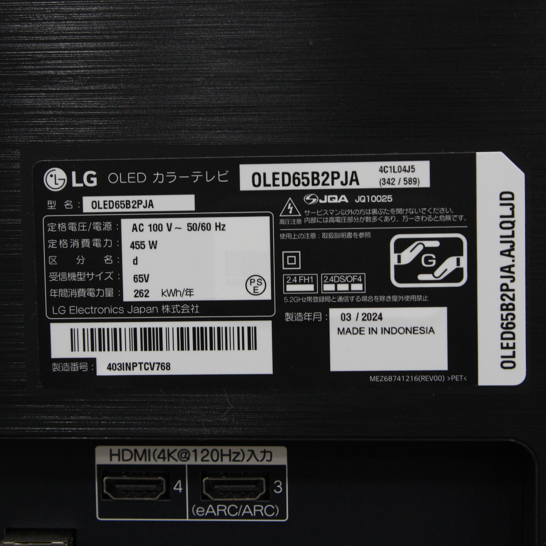 〔展示品〕 有機ELテレビ OLED TV(オーレッド・テレビ) OLED65B2PJA [65V型 /Bluetooth対応 /4K対応 /BS・CS 4Kチューナー内蔵 /YouTube対応]