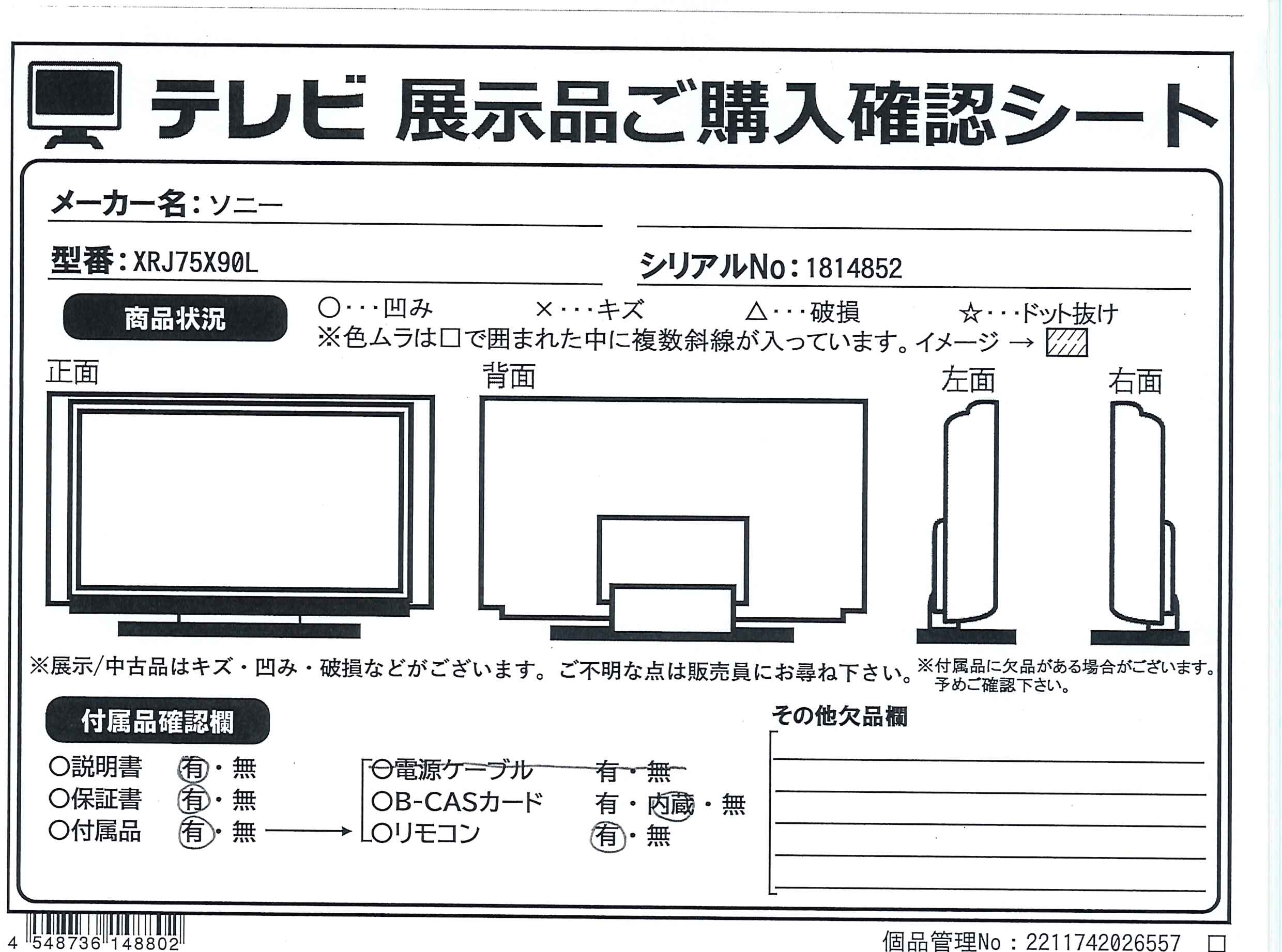 商品名 〔展示品〕 液晶テレビ BRAVIA(ブラビア) XRJ-75X90L [75V型 /Bluetooth対応 /4K対応 /BS・CS 4Kチューナー内蔵 /YouTube対応]